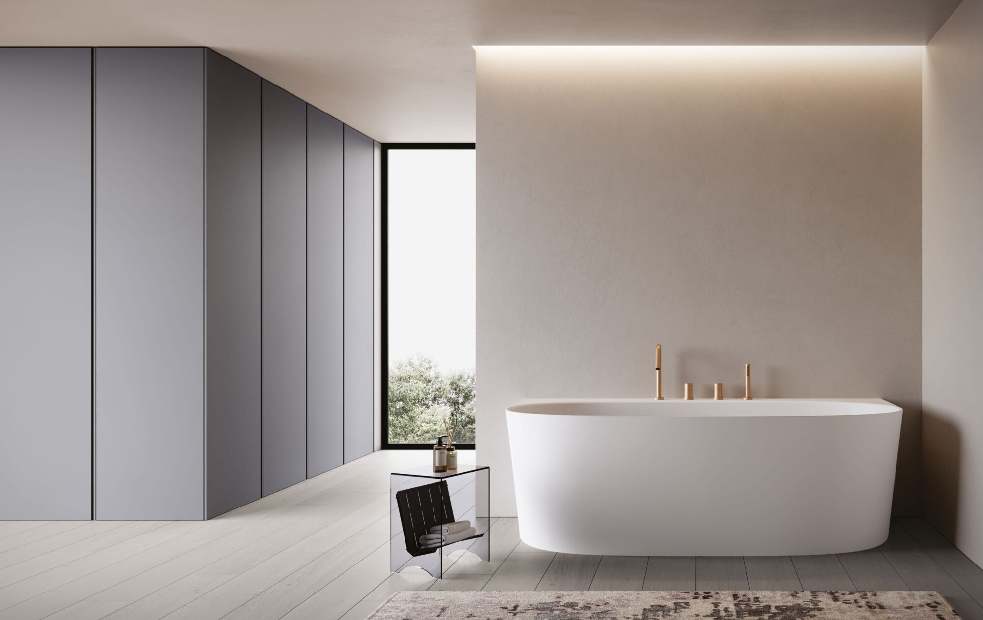 Un diseño de formas suaves y envolventes que transmite calma y bienestar, una estética que relata el encuentro entre elegancia y contemporaneidad: Bull es la bañera de pared, disponible en tres tamaños, sin rebosadero, con tapón de drenaje «Up & Down», fabricada en M-Solid en acabado Bianco mate. Puede ser lacada mate interior y exteriormente en los colores del muestrario Ideagroup y de las cartas RAL y NCS. Acabado del tapón de drenaje a juego.
