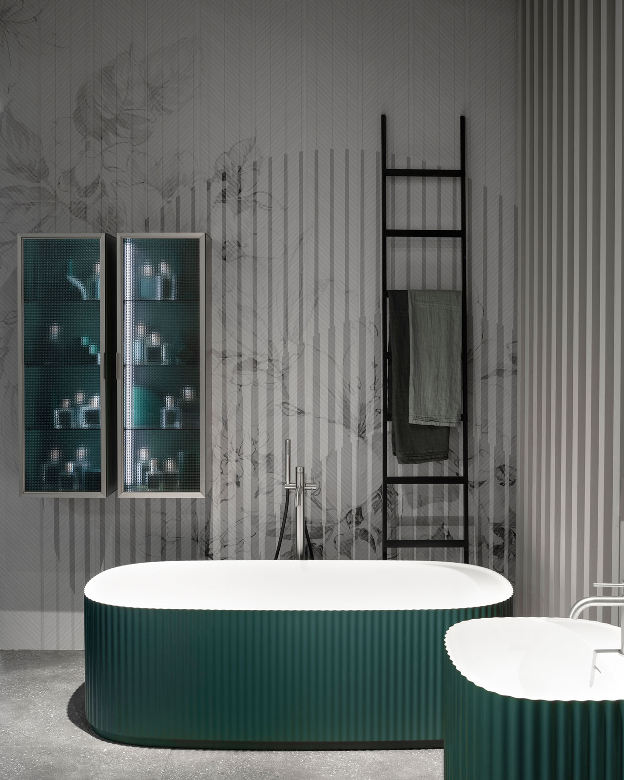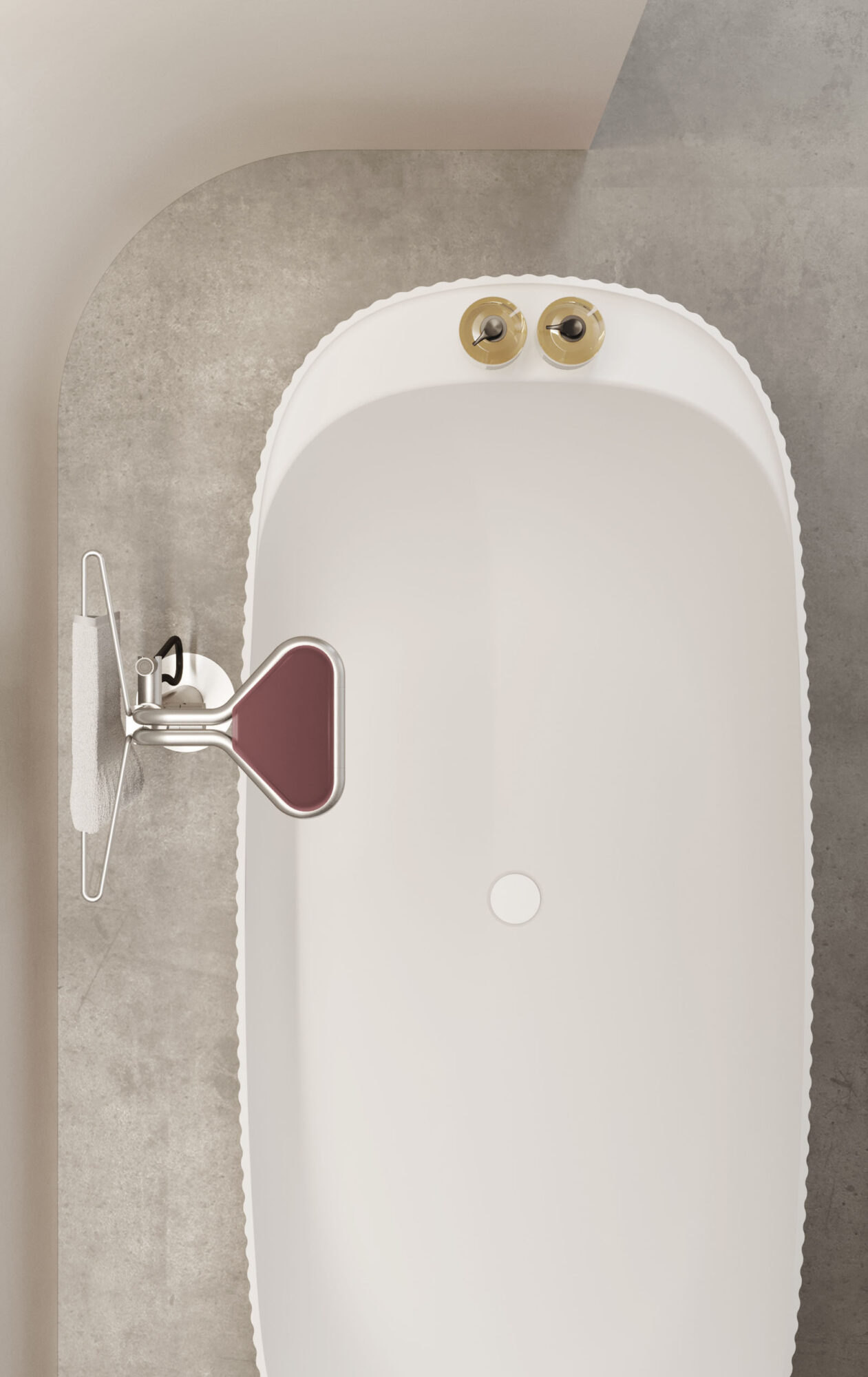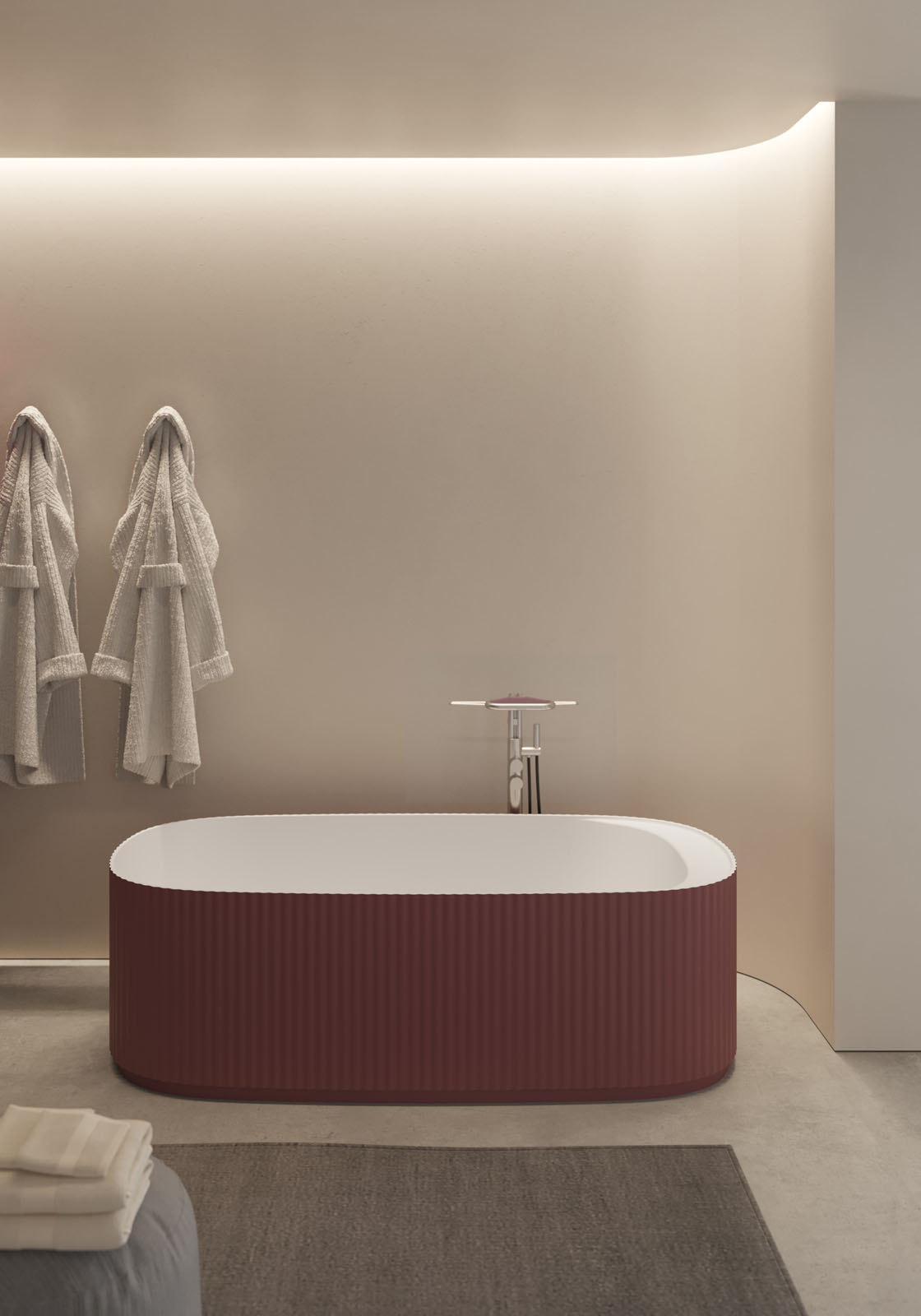 La bañera independiente Giove completa el proyecto de decoración creado con el homónimo lavabo monolítico diseñado por Riccardo Gava, ganador de los premios Archiproducts Design Awards 2023 y Red Dot 2024. La bañera Giove retoma las suaves ondas verticales y desarrolla la forma del lavabo en una elipse alargada capaz de acoger el cuerpo gracias al estudio ergonómico del volumen interior y exterior. Uno de los extremos interiores está modelado para sostener la trasera y los laterales y crear un cómodo espacio de apoyo dedicado a la grifería integrada, si está prevista. Si se opta por la combinación con una grifería independiente, este espacio es útil para apoyar los productos de cuidado corporal. El tapón de drenaje patentado dispone de un sistema de rebosadero integrado con funcionamiento mecánico diseñado para abrirse automáticamente cuando el agua supera el nivel de seguridad preestablecido. En la parte inferior del volumen hay un rebaje, un zócalo, un elemento decorativo adicional, que tiene una función ergonómica porque deja espacio para el pie y permite asumir una postura correcta durante los gestos cotidianos.
