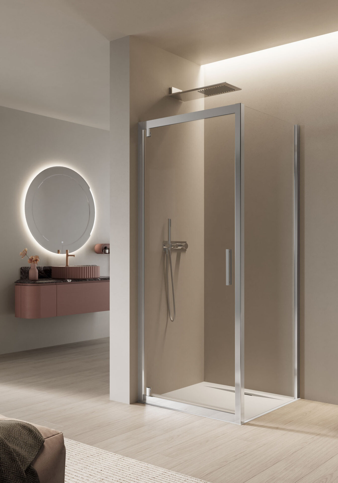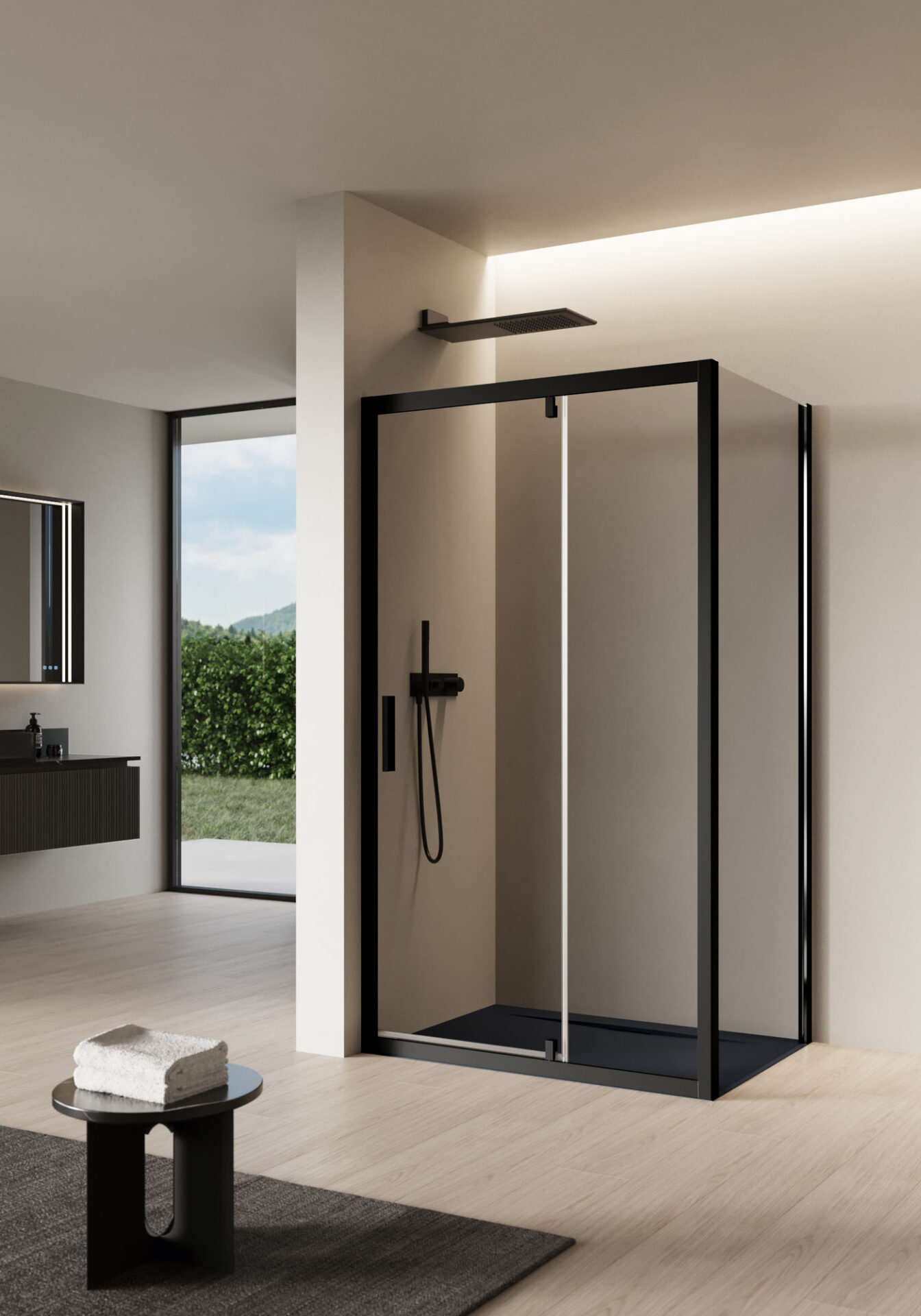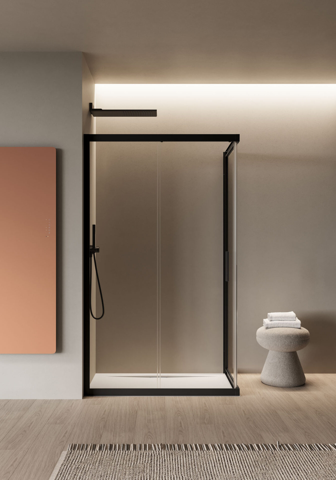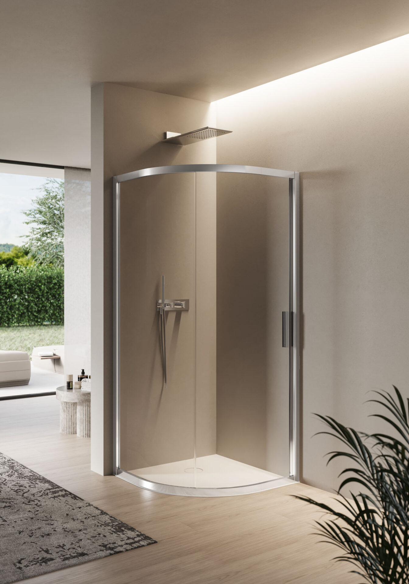 Funcionalidad aplicada a la cabina de ducha. La solución ducha con marco se convierte en protagonista gracias a una fuerte personalidad estética. Los mecanismos y detalles regalan nuevas siluetas geométricas y paralelismos irrenunciables. Origo significa también cabina de ducha curva.