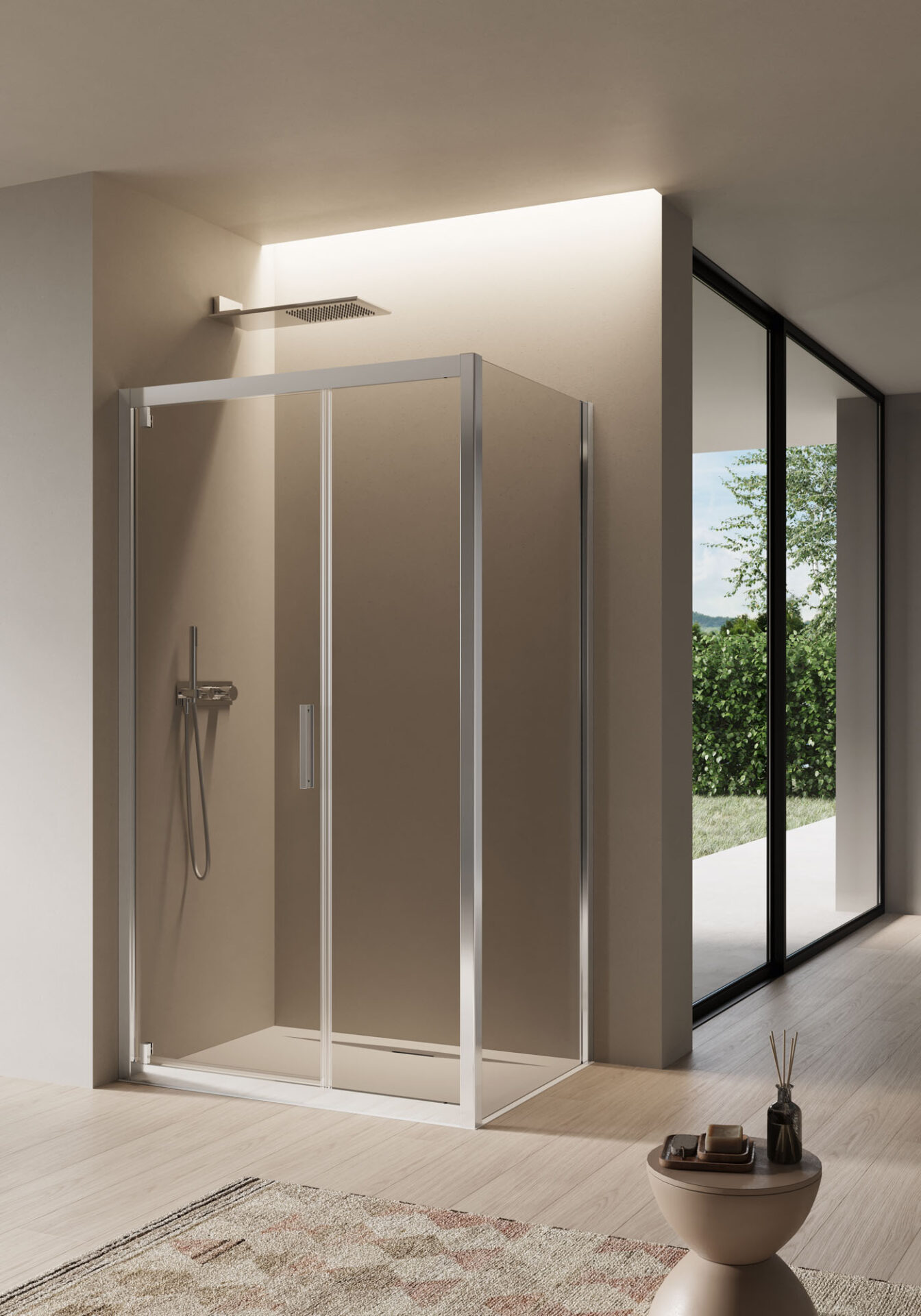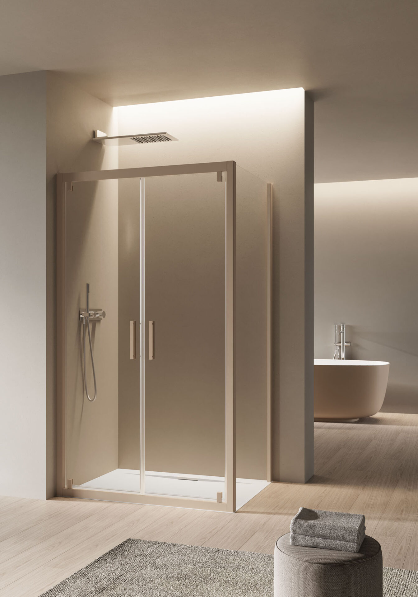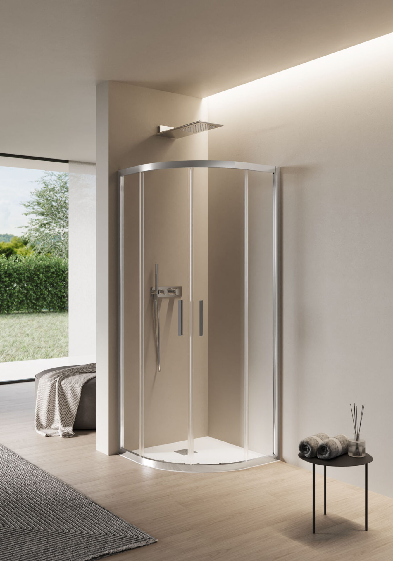 Funcionalidad aplicada a la cabina de ducha. La solución ducha con marco se convierte en protagonista gracias a una fuerte personalidad estética. Los mecanismos y detalles regalan nuevas siluetas geométricas y paralelismos irrenunciables. Origo significa también cabina de ducha curva.