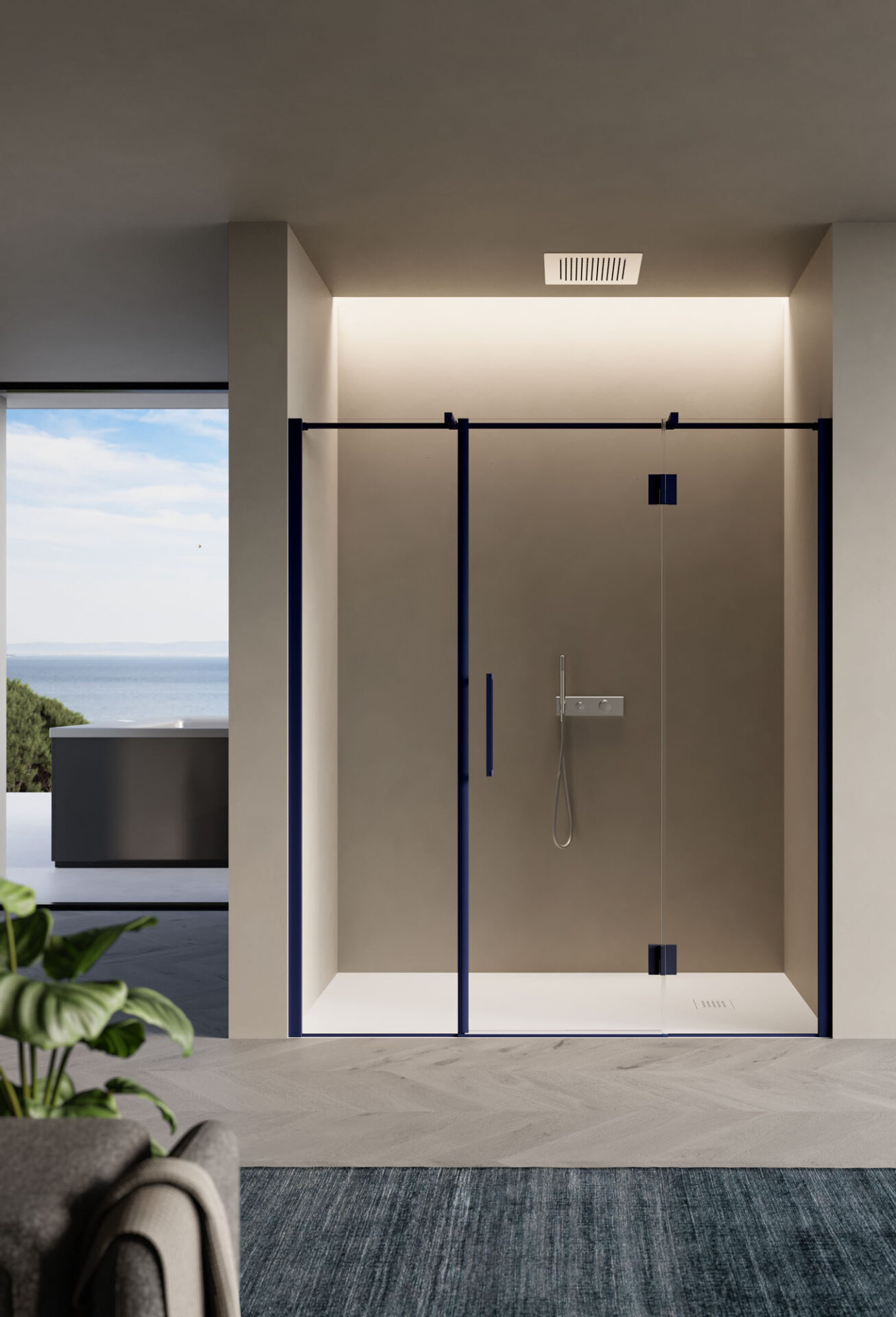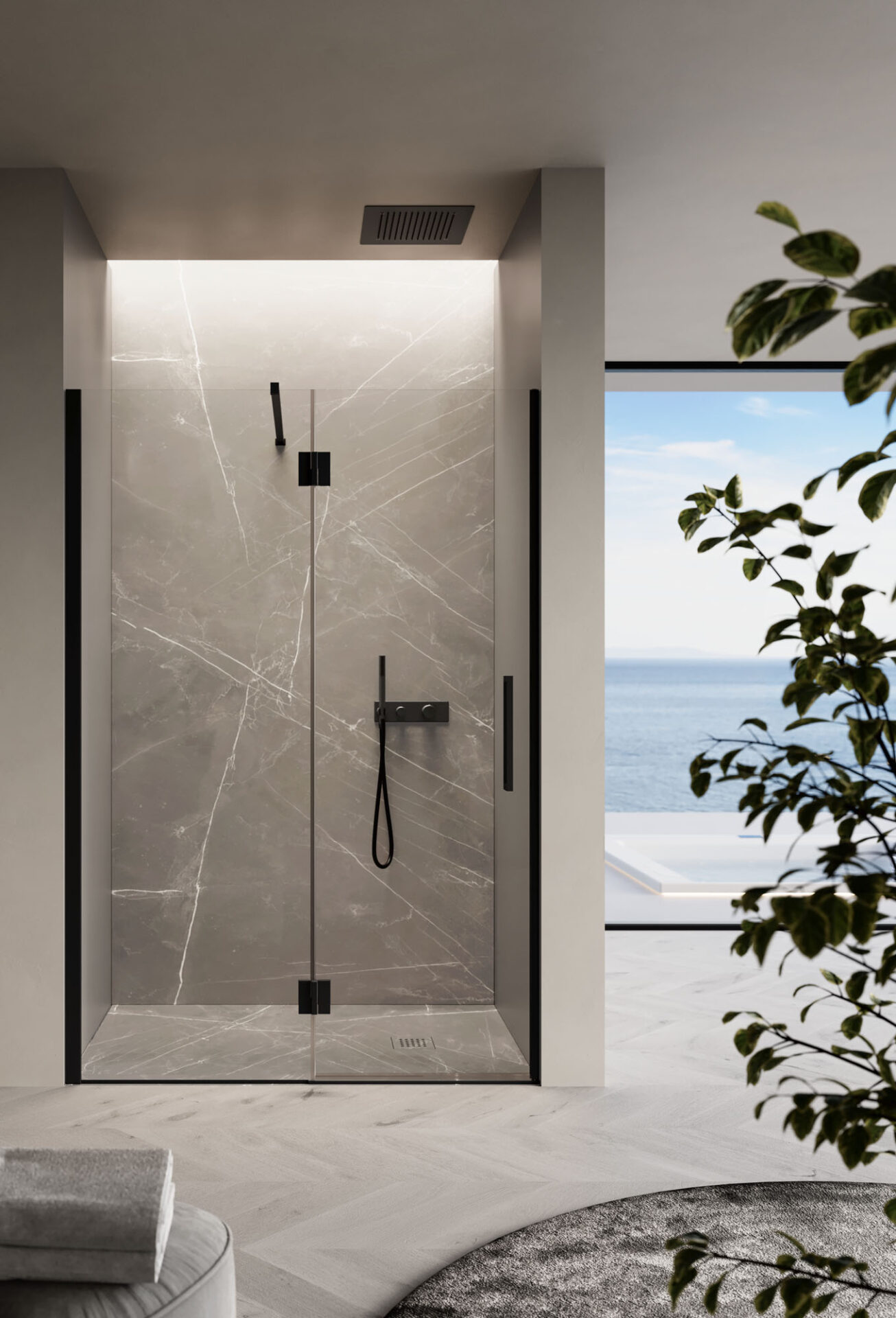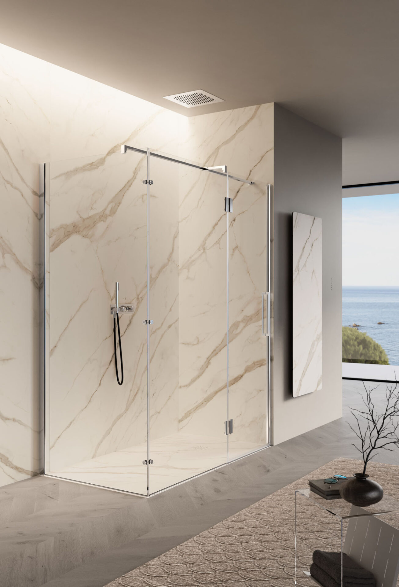 Easy es la cabina de ducha sin bastidor con puerta batiente, de diseño esencial, disponible en la versión con mampara frontal, angular, de pared y sobre un muro bajo. Las bisagras están completamente enrasadas con el vidrio en la parte interior, lo que permite que la puerta se abra a 180°. El tirador es de doble cara.