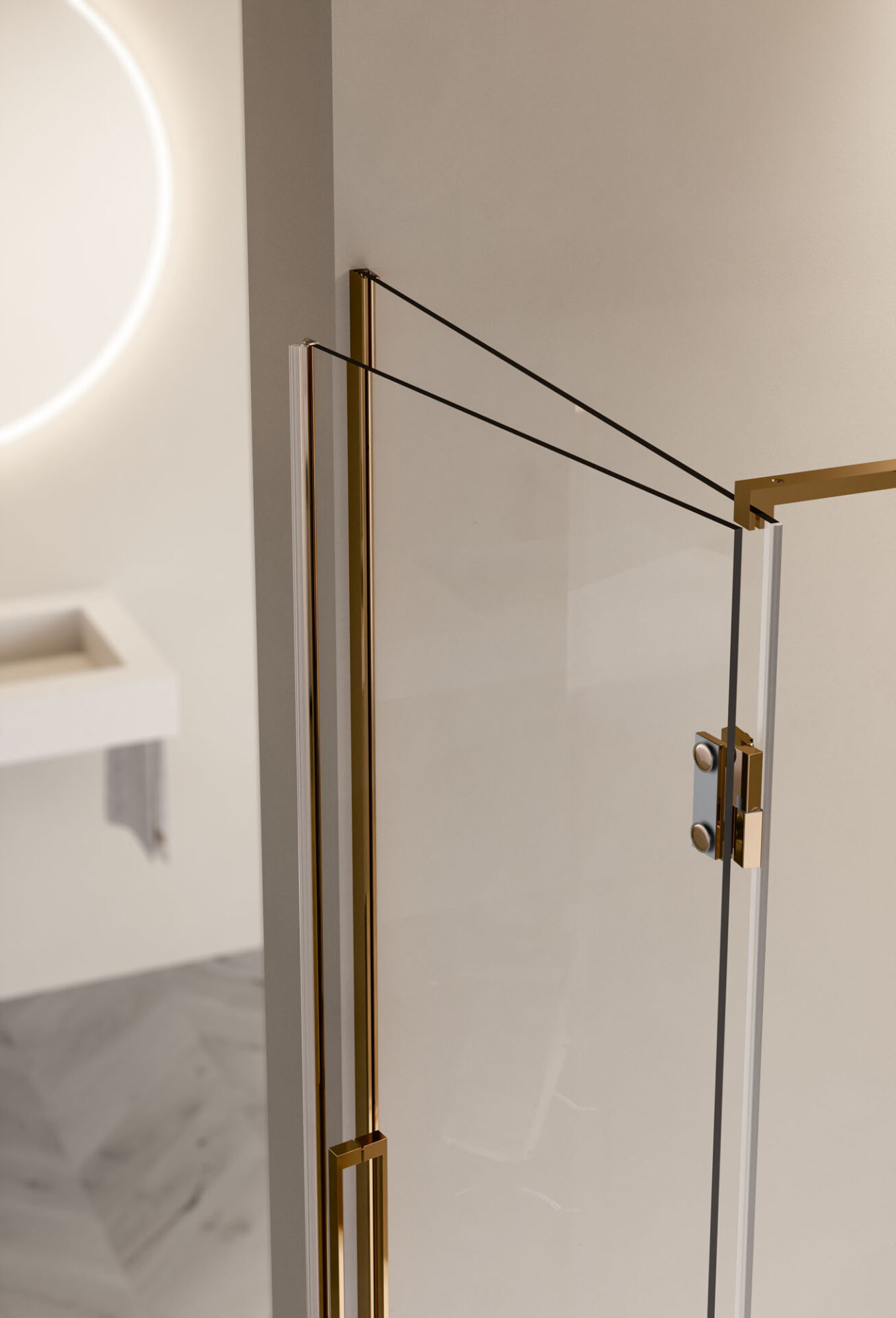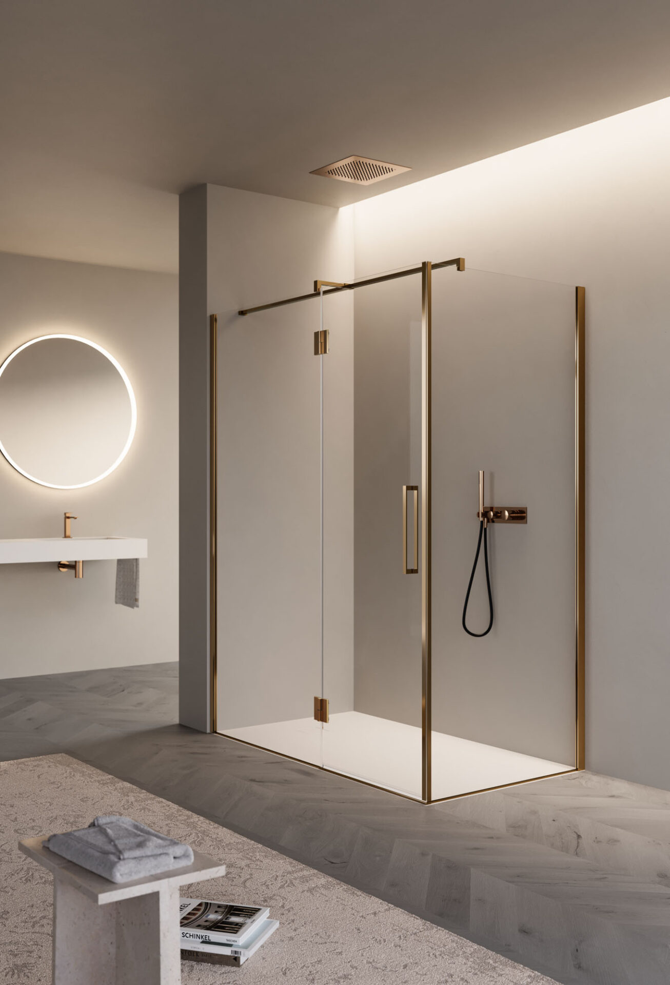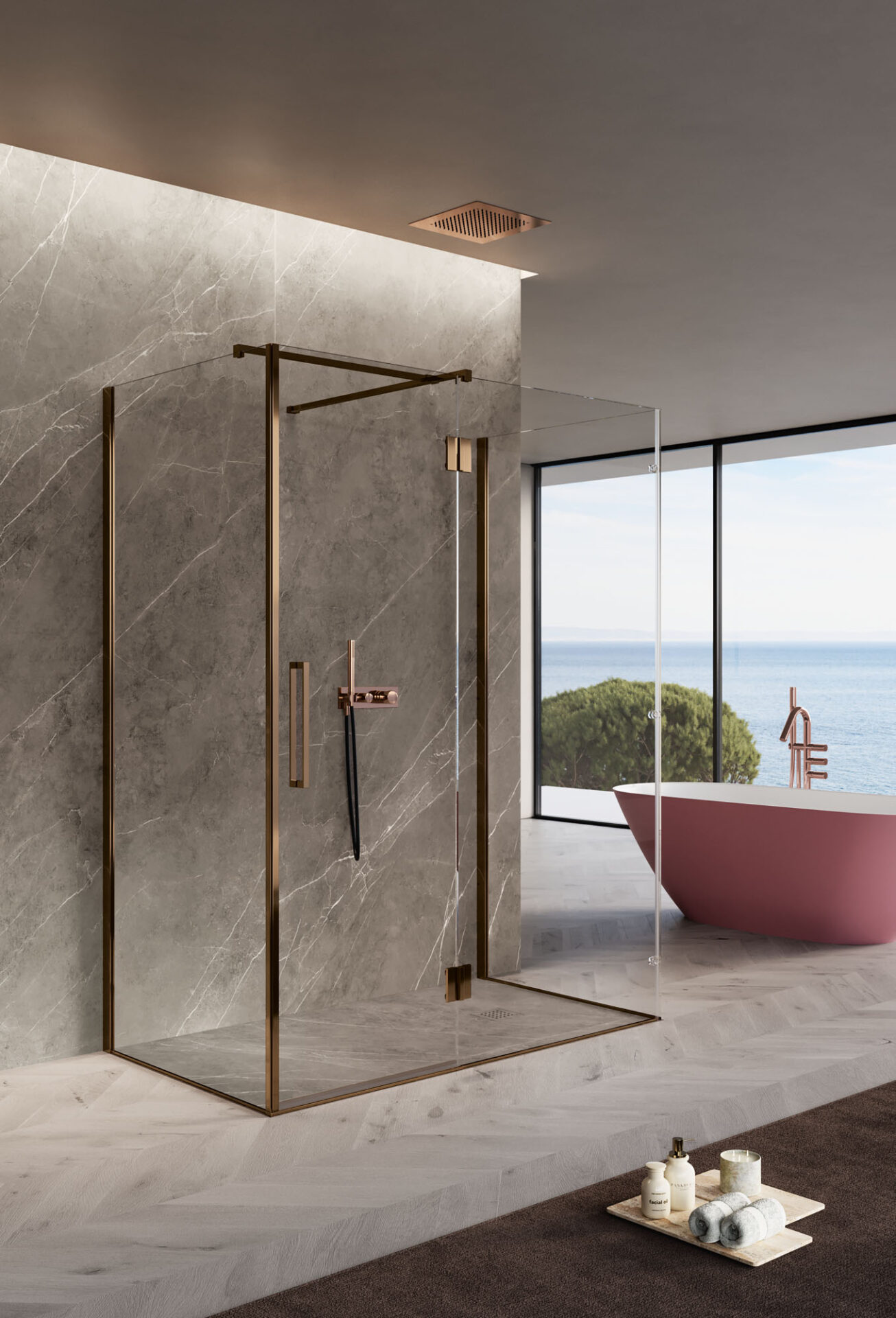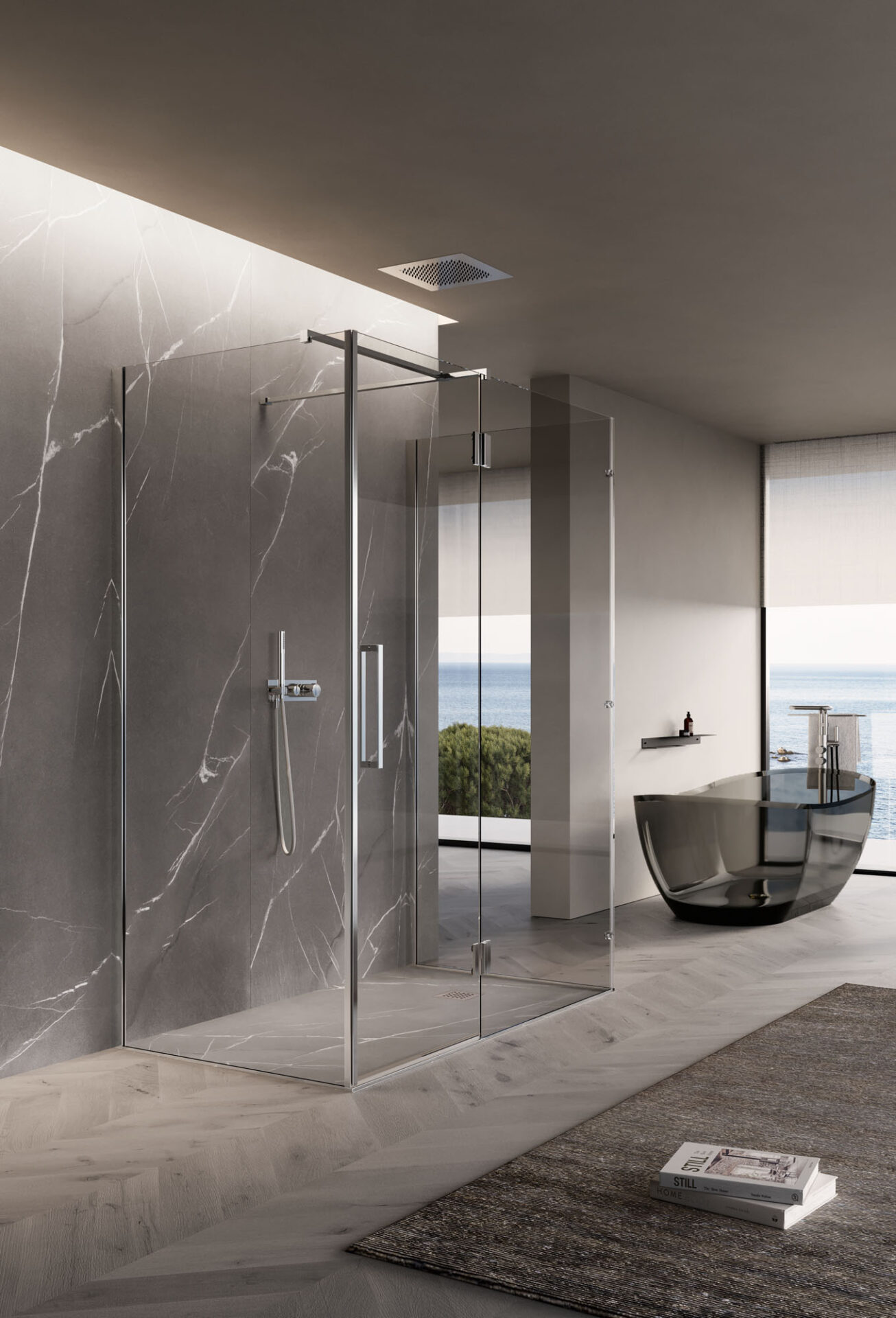 Easy es la cabina de ducha sin bastidor con puerta batiente, de diseño esencial, disponible en la versión con mampara frontal, angular, de pared y sobre un muro bajo. Las bisagras están completamente enrasadas con el vidrio en la parte interior, lo que permite que la puerta se abra a 180°. El tirador es de doble cara.