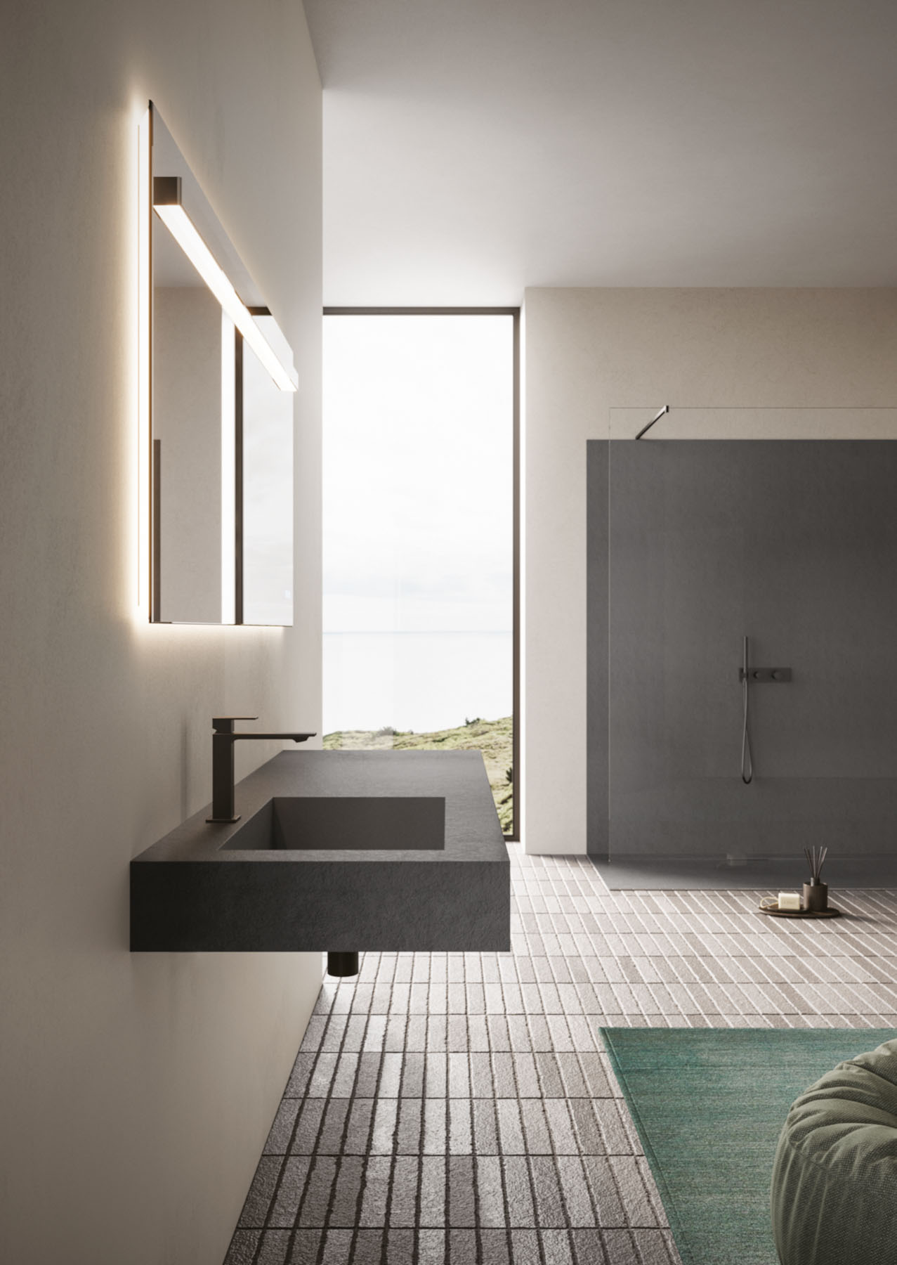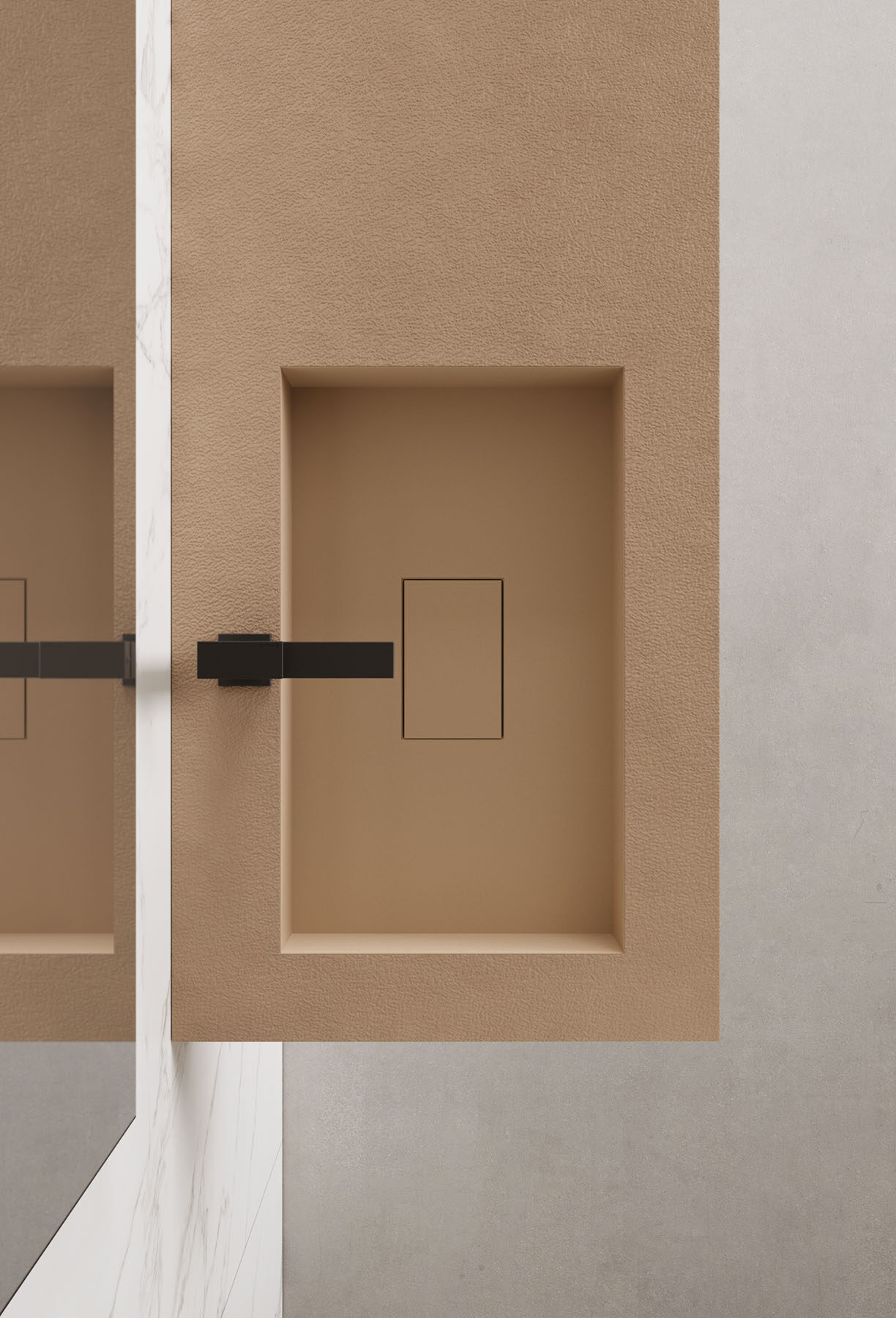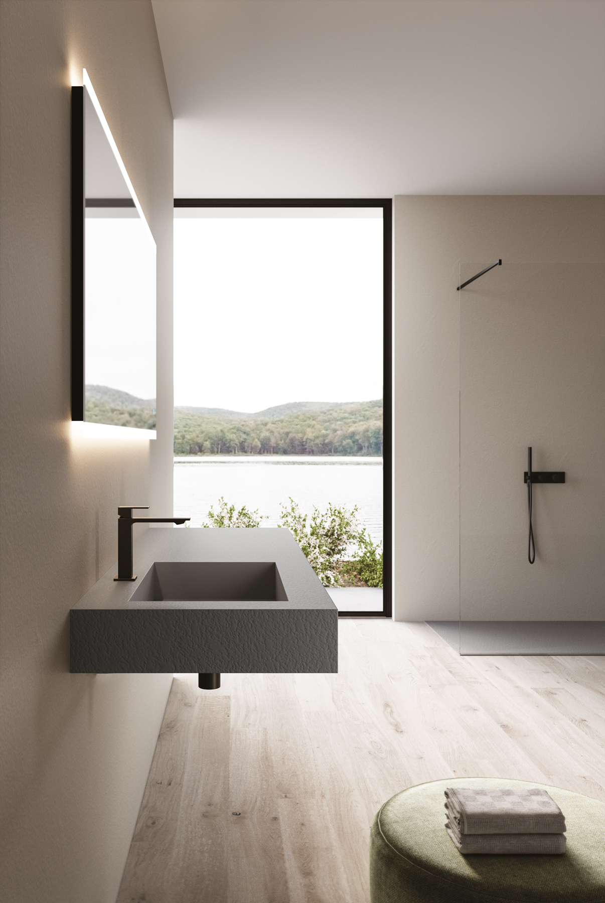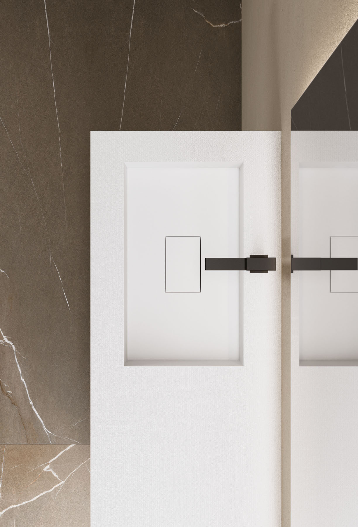 Las texturas de los platos de ducha de Tecnogel – Dual, Luna, Piano, Join, Nolita, Krus y Open – con sus respectivas tonalidades, pueden combinarse con las encimeras de núcleo hueco con lavabo integrado y con los revestimientos de las paredes, así como con las encimeras de muebles de baño y radiadores decorativos.