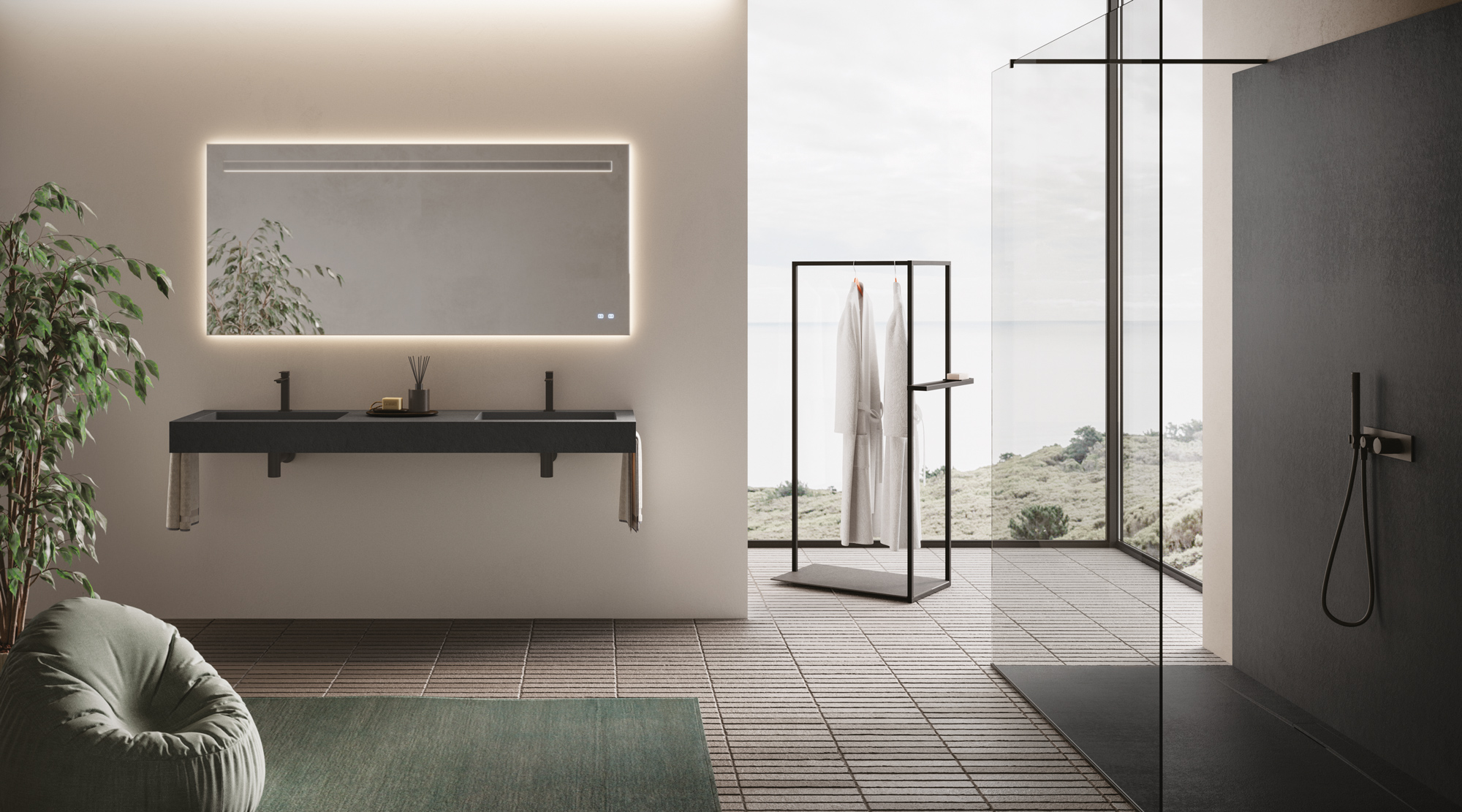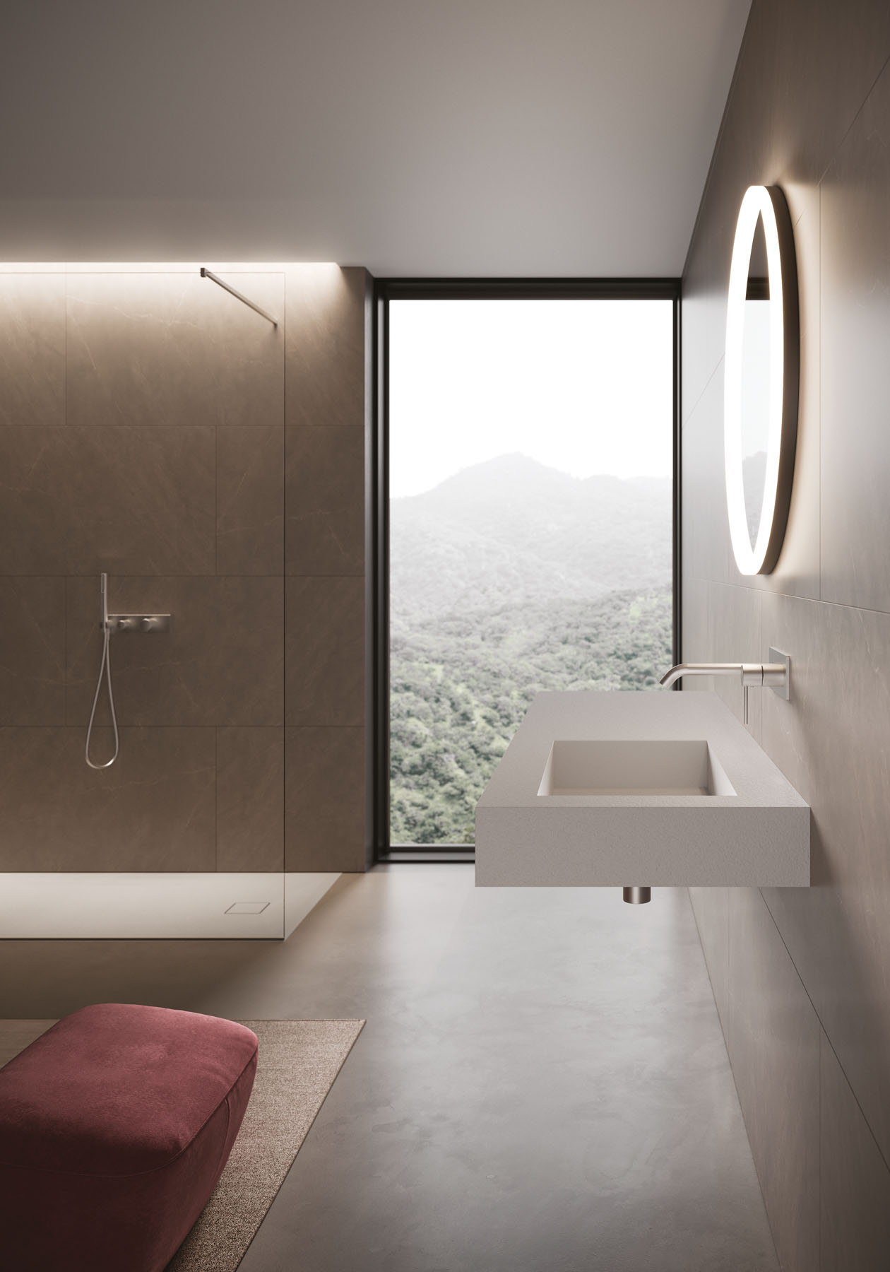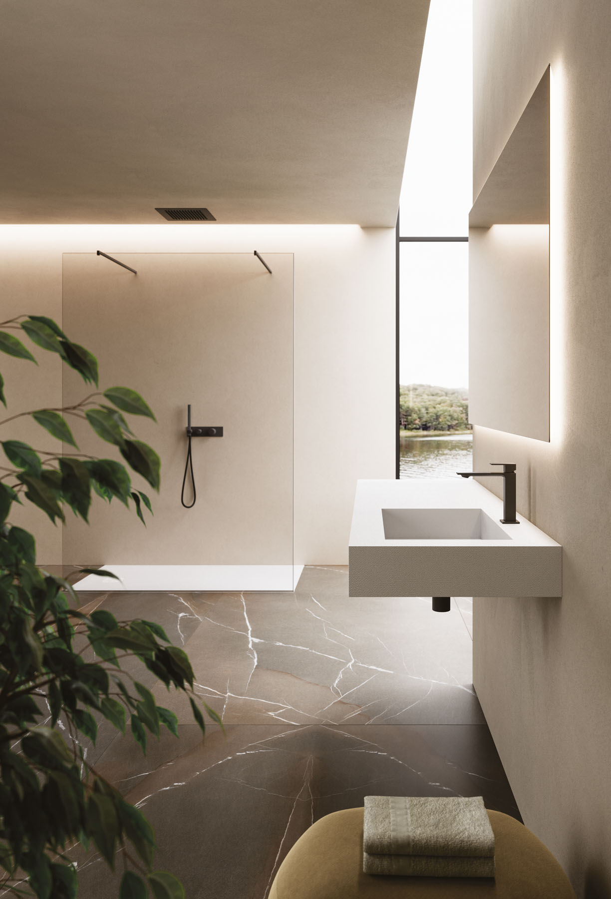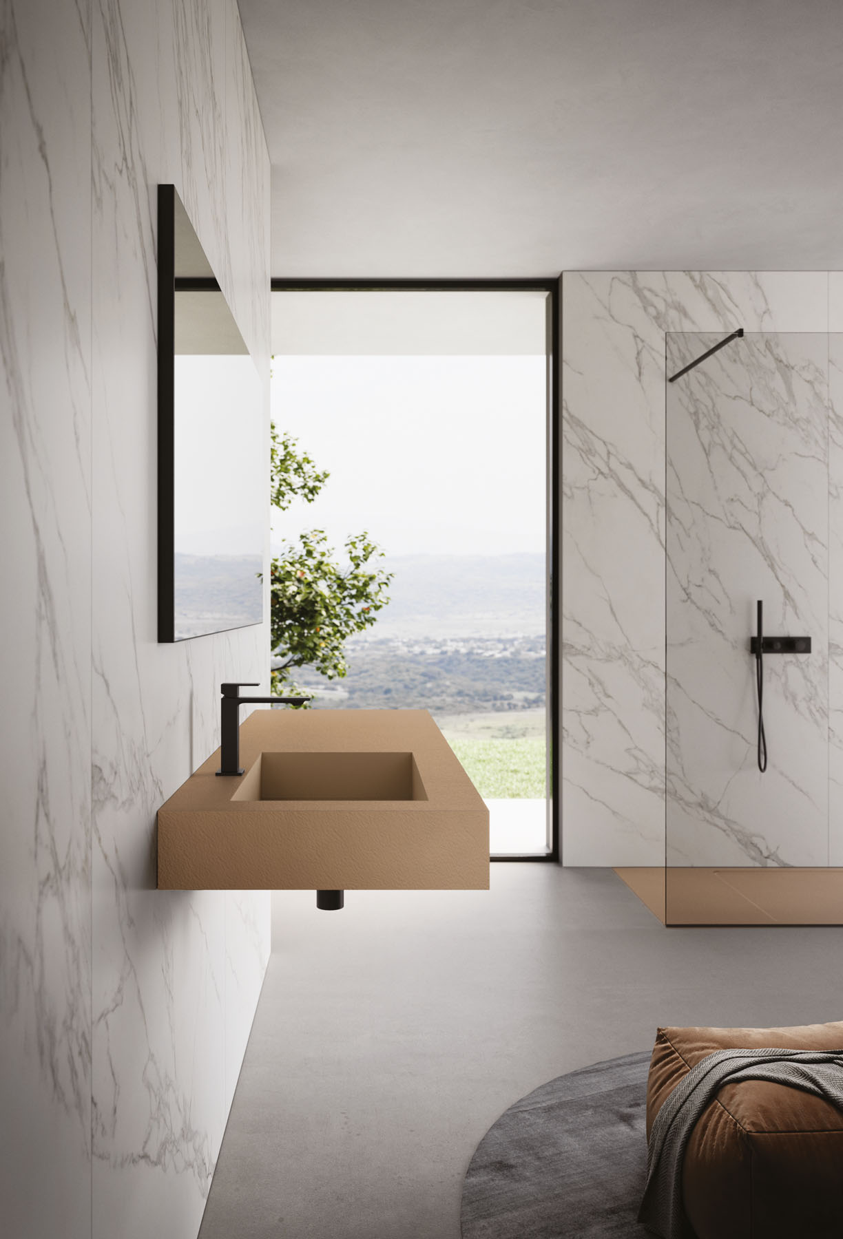 Las texturas de los platos de ducha de Tecnogel – Dual, Luna, Piano, Join, Nolita, Krus y Open – con sus respectivas tonalidades, pueden combinarse con las encimeras de núcleo hueco con lavabo integrado y con los revestimientos de las paredes, así como con las encimeras de muebles de baño y radiadores decorativos.