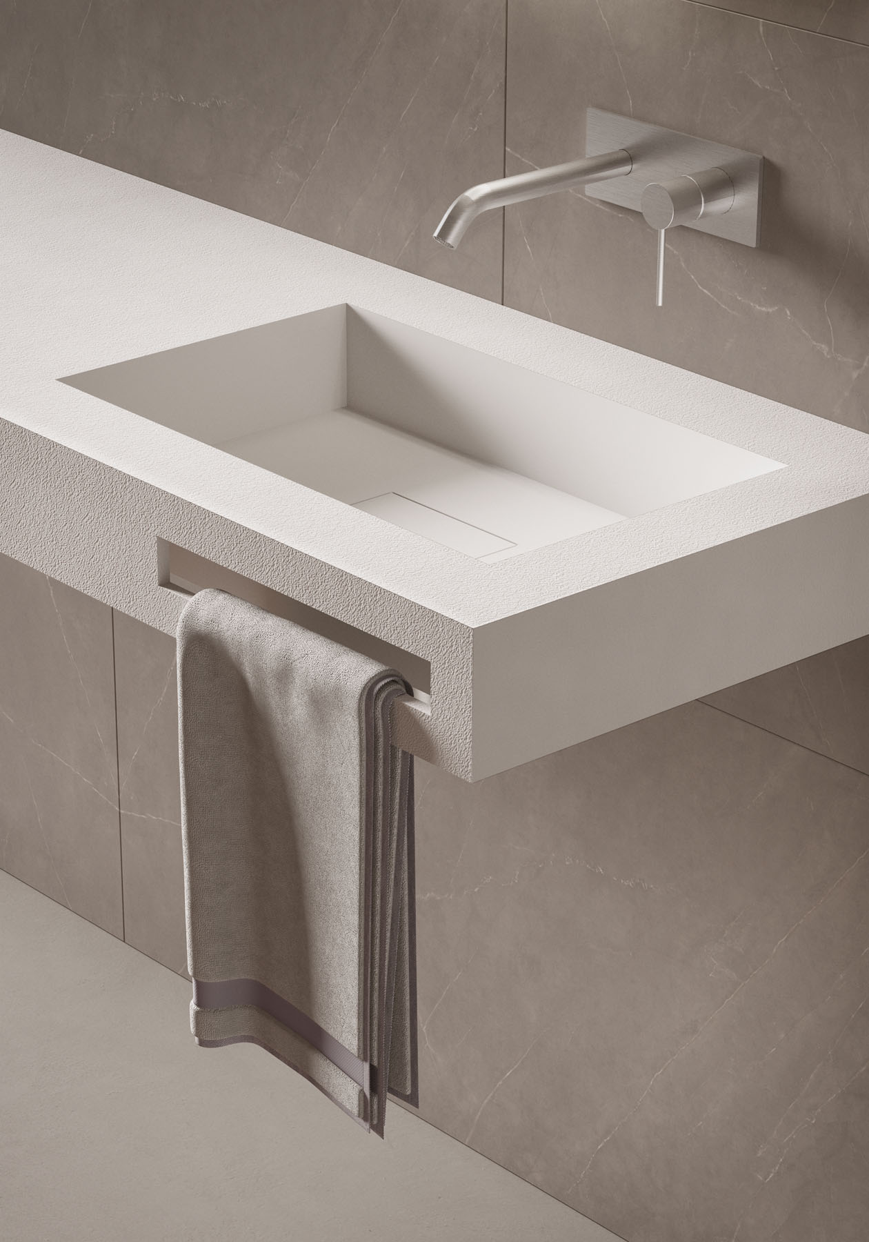 Como opción, el toallero puede integrarse lateral o frontalmente, el desagüe está centrado, sin rebosadero.