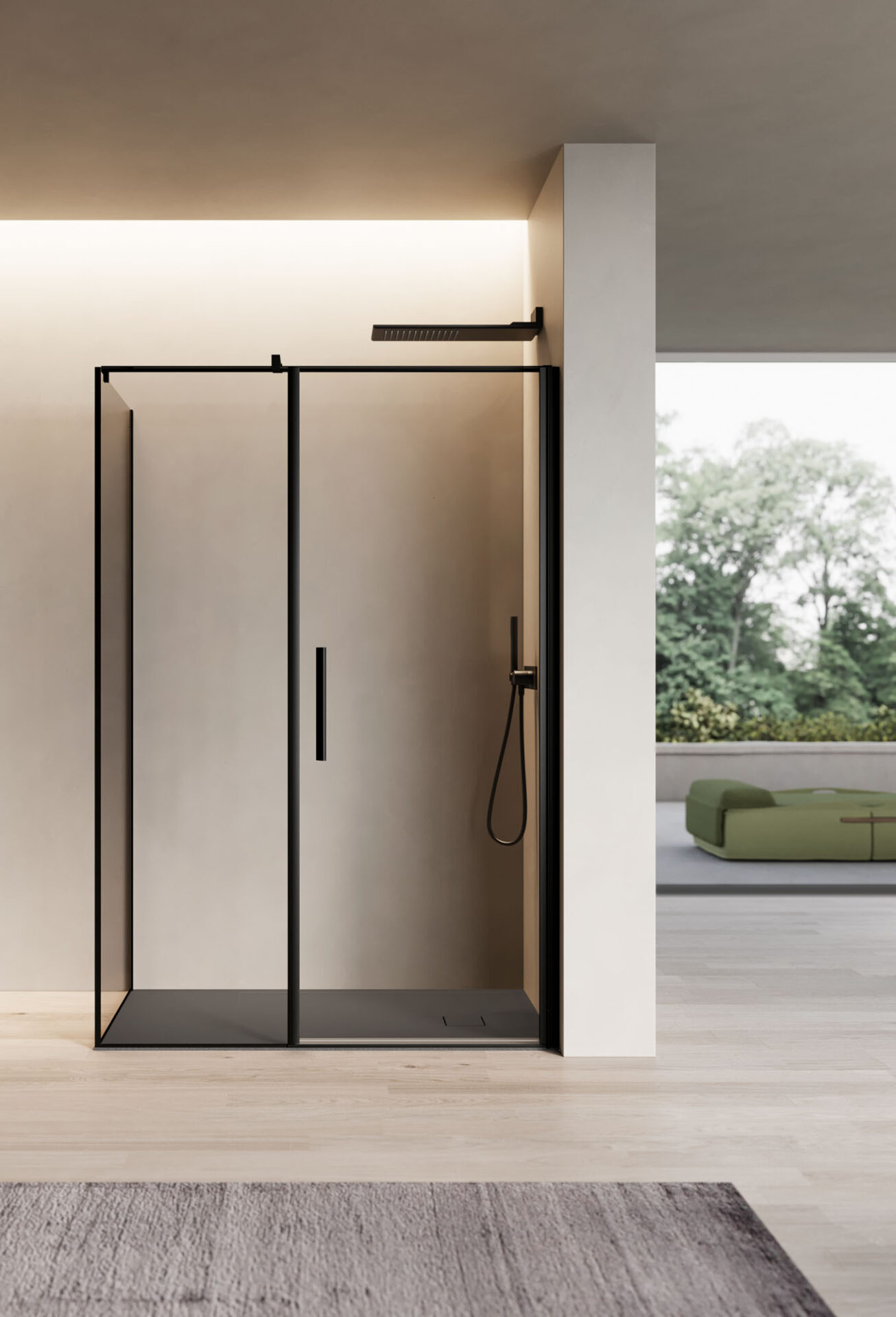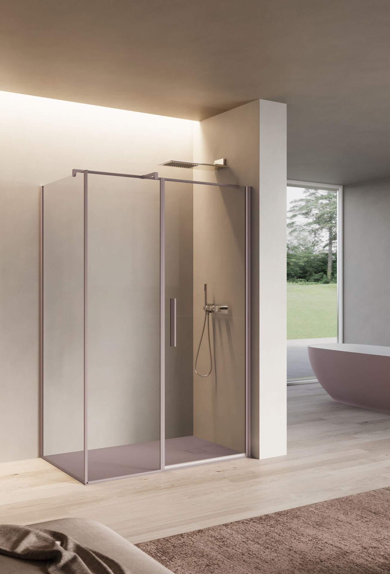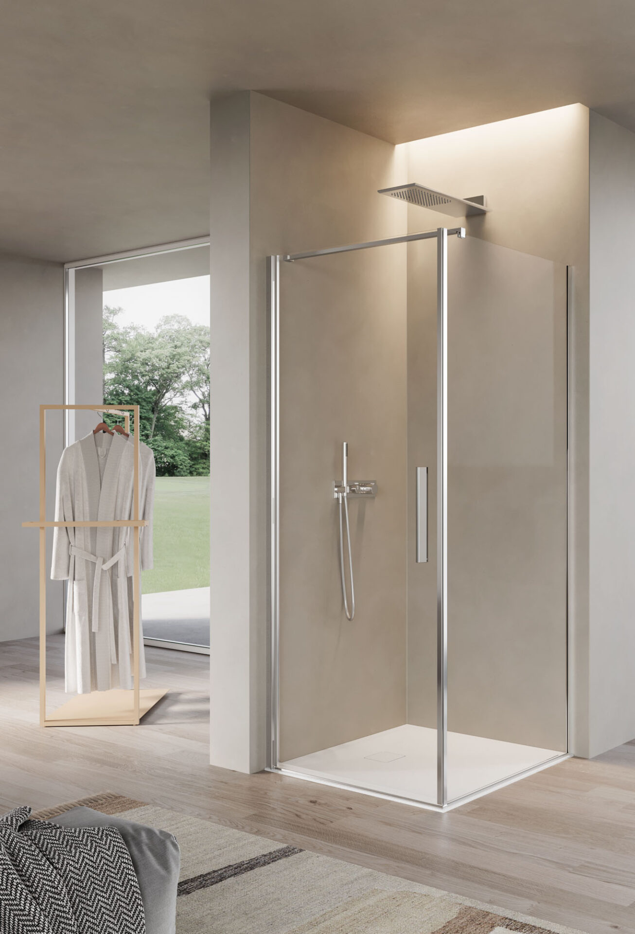 Luce es la cabina de ducha con puerta batiente, disponible en la versión con mampara frontal, angular y sobre muro bajo. La bisagra tiende a desaparecer gracias a la continuidad con la forma del perfil que puede instalarse directamente en la pared.