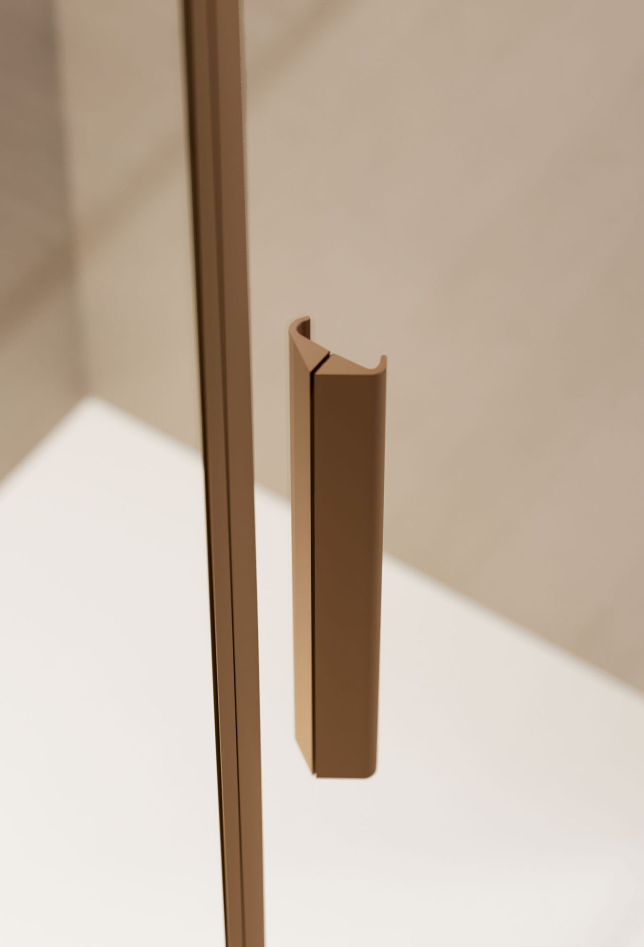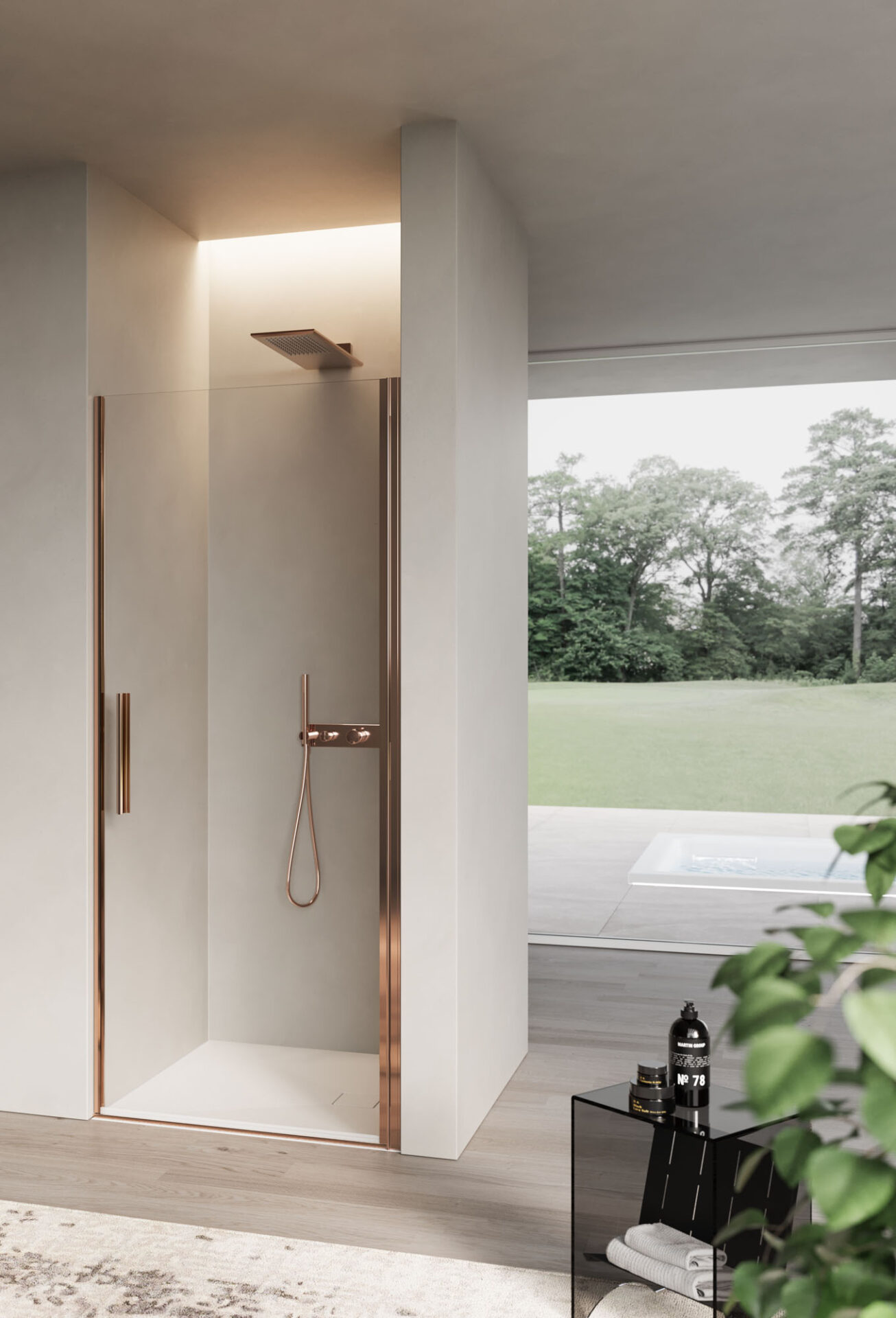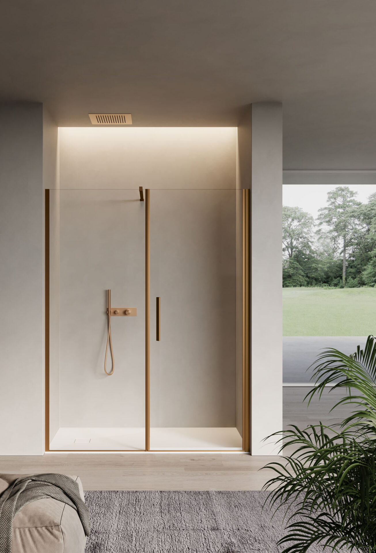 Luce es la cabina de ducha con puerta batiente, disponible en la versión con mampara frontal, angular y sobre muro bajo. La bisagra tiende a desaparecer gracias a la continuidad con la forma del perfil que puede instalarse directamente en la pared.