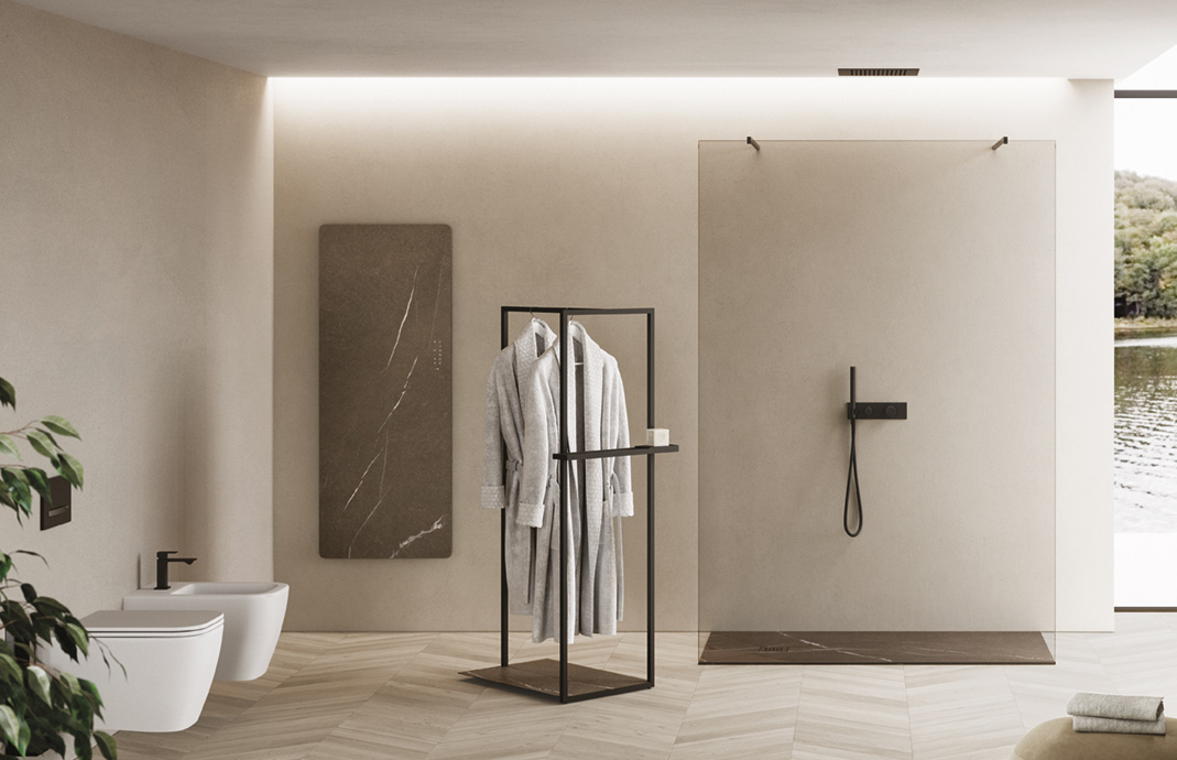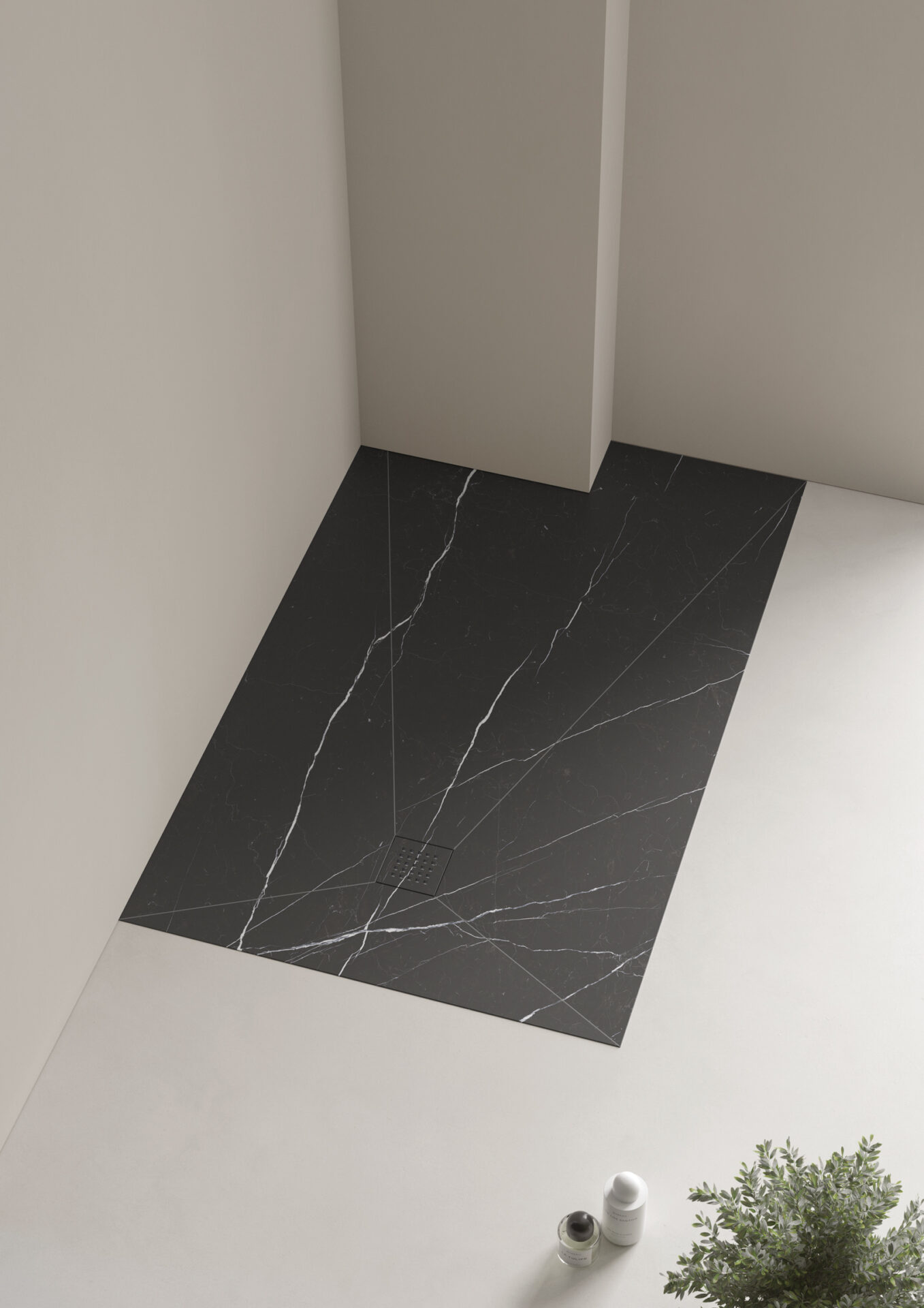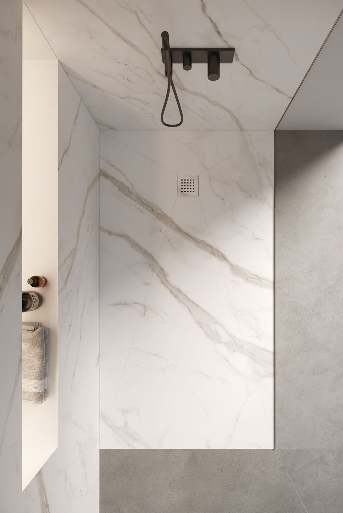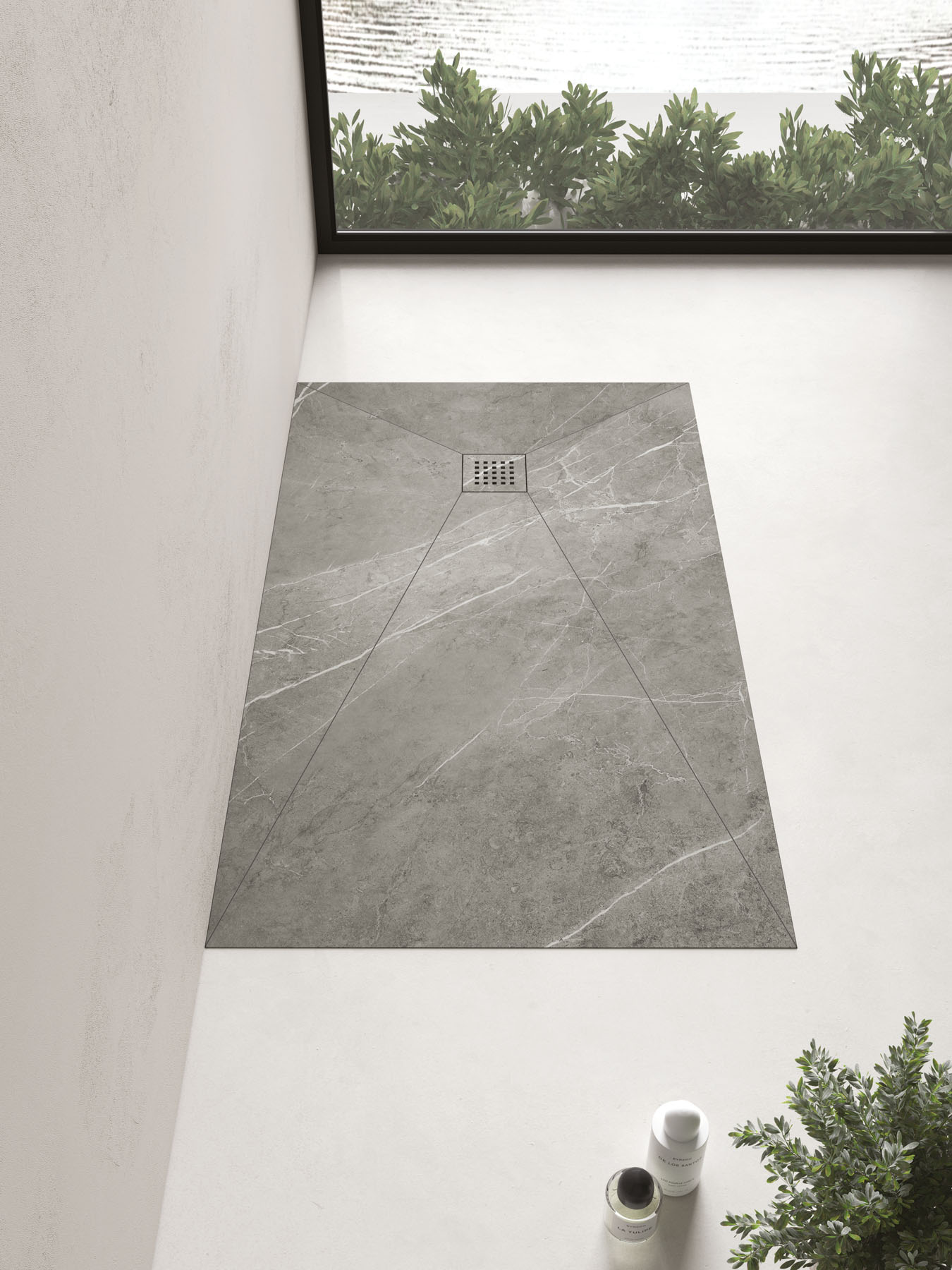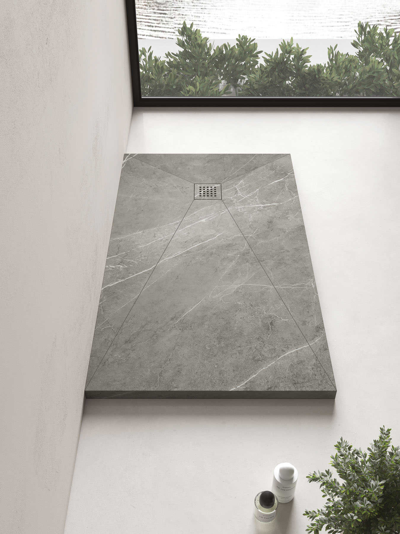 Plato de ducha de Gres de estética contemporánea que amplía las posibilidades de coordinación dentro del cuarto de baño: combinable con las encimeras con lavabo integrado Ideagroup y el radiador decorativo Helios.