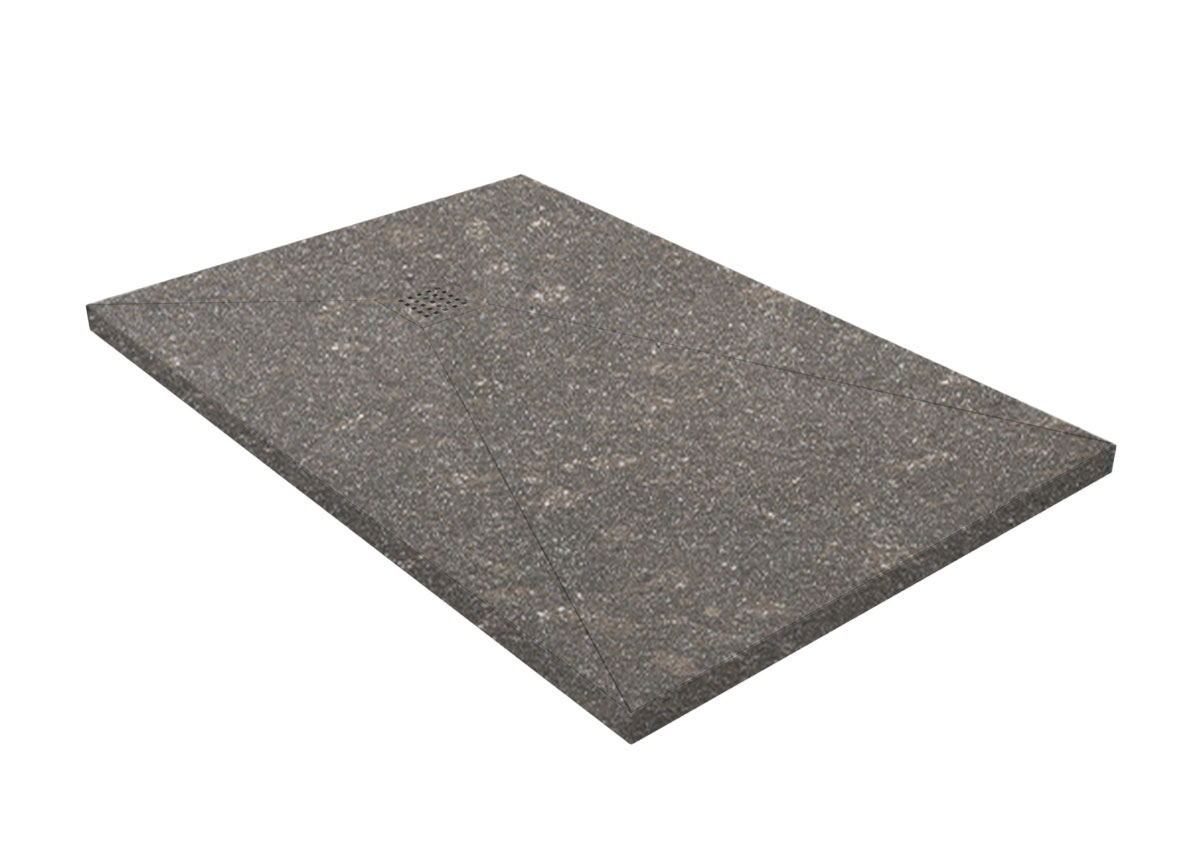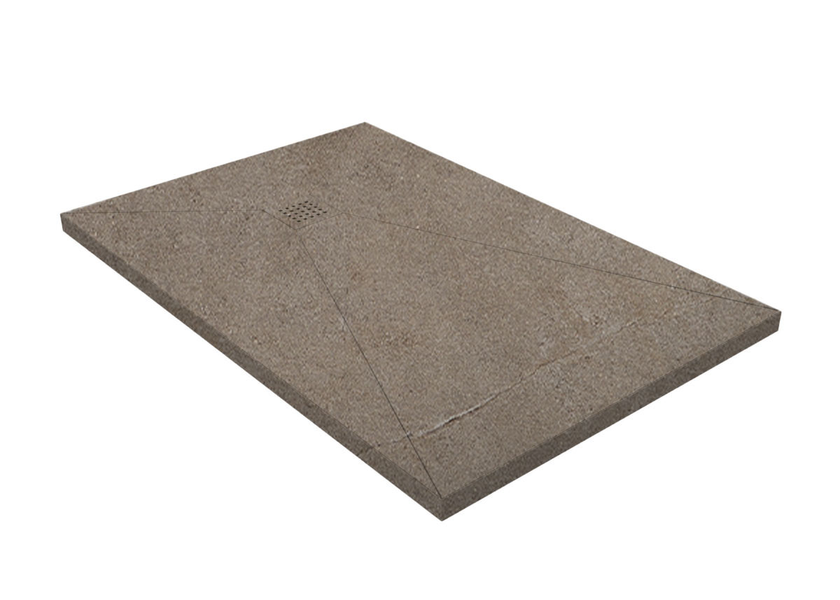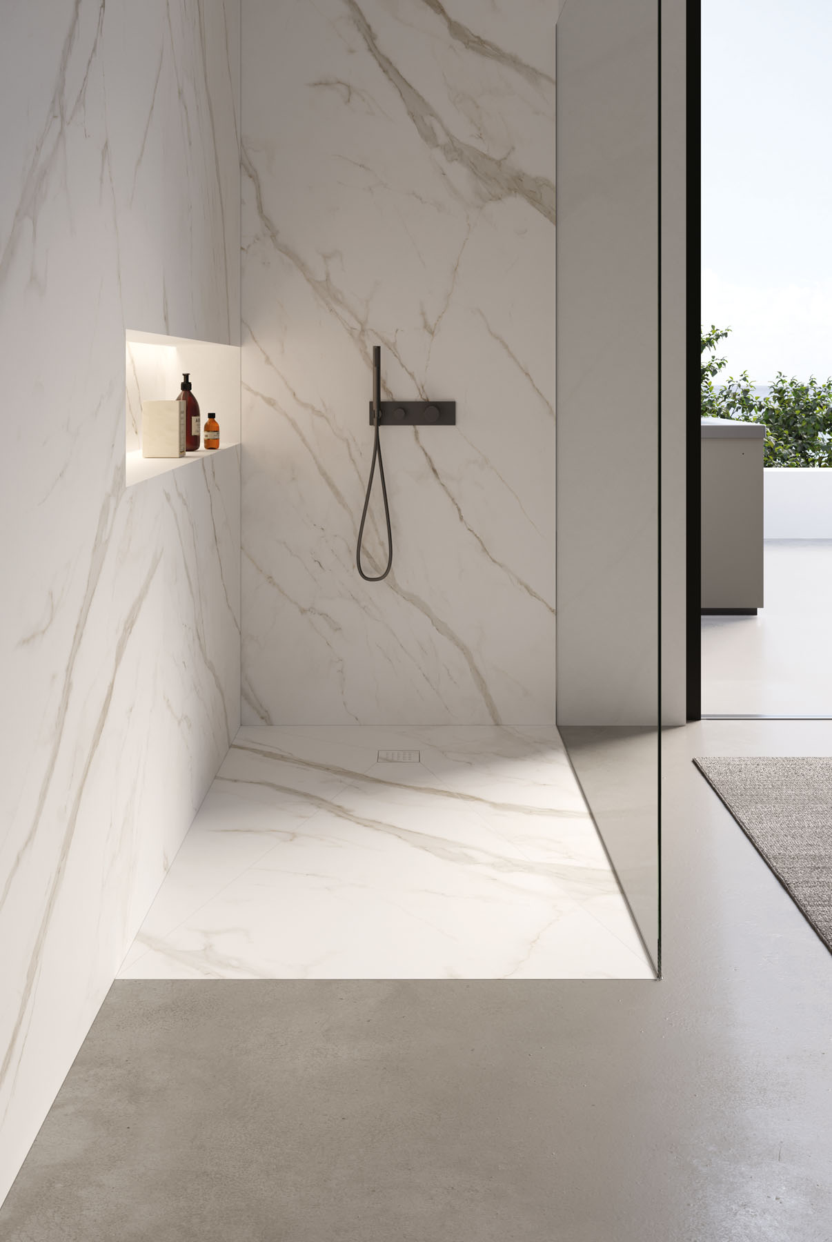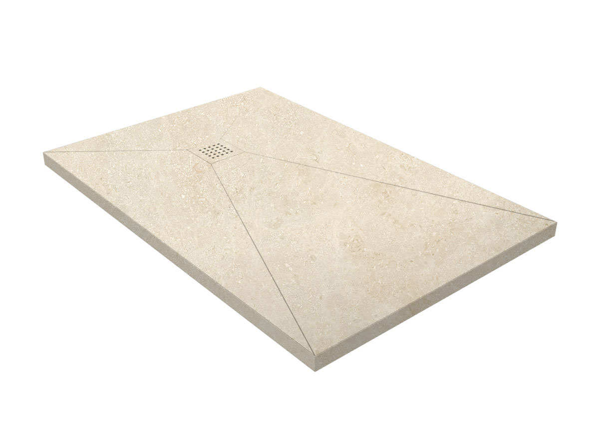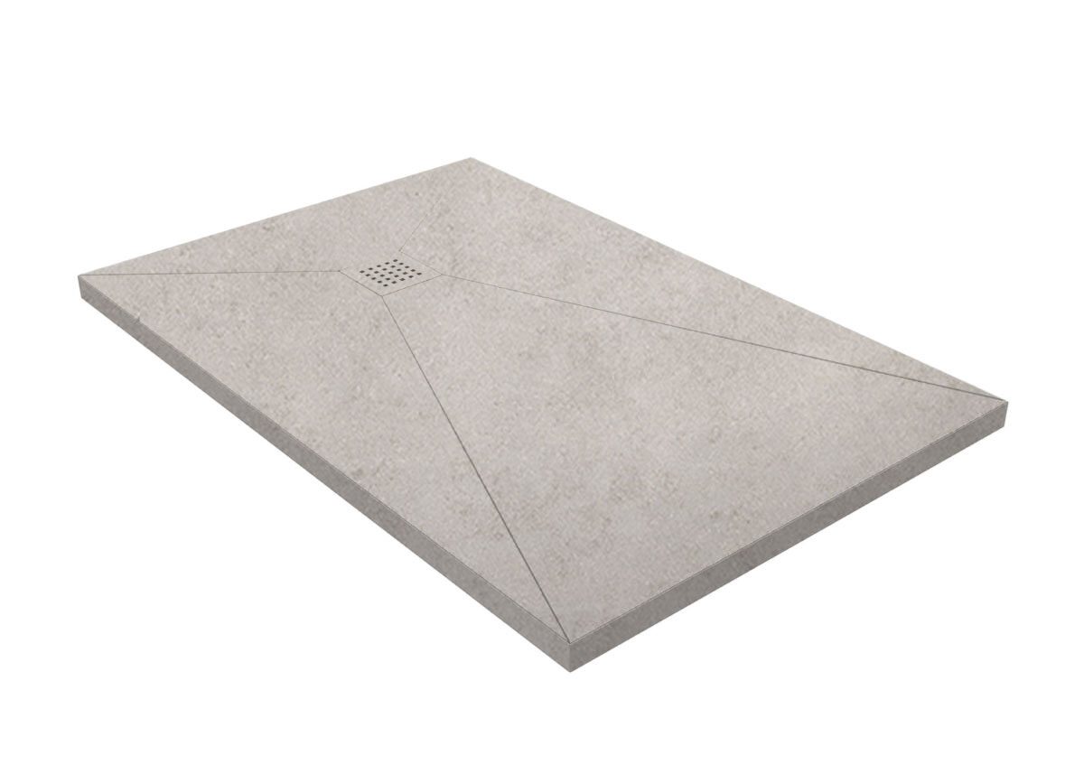 Plato de ducha de Gres de estética contemporánea que amplía las posibilidades de coordinación dentro del cuarto de baño: combinable con las encimeras con lavabo integrado Ideagroup y el radiador decorativo Helios.