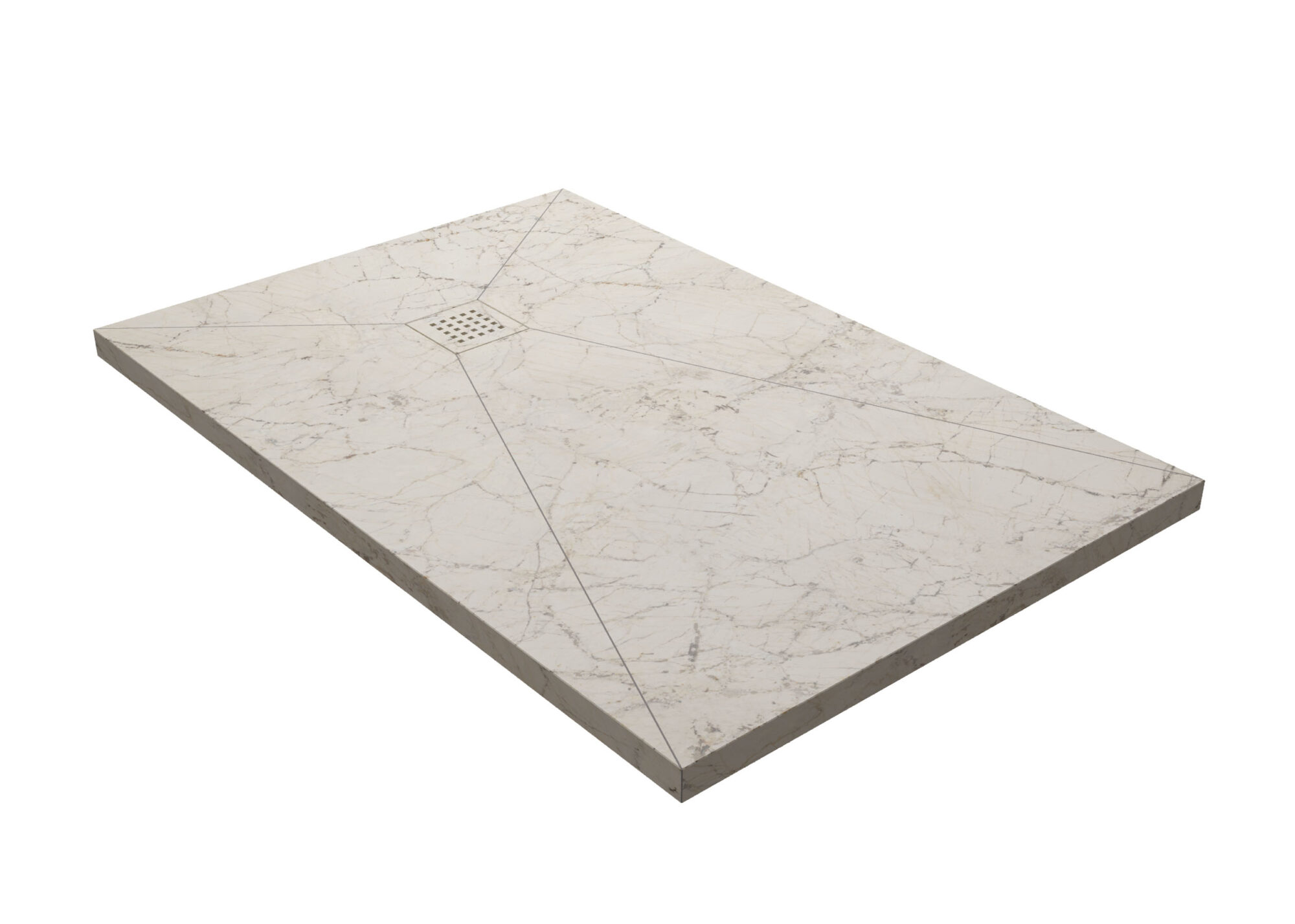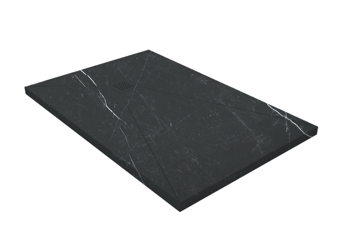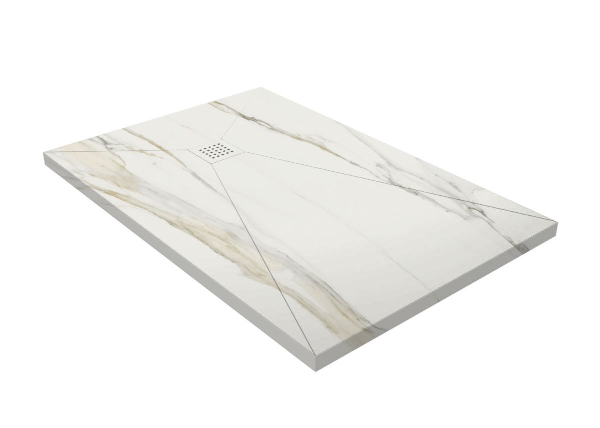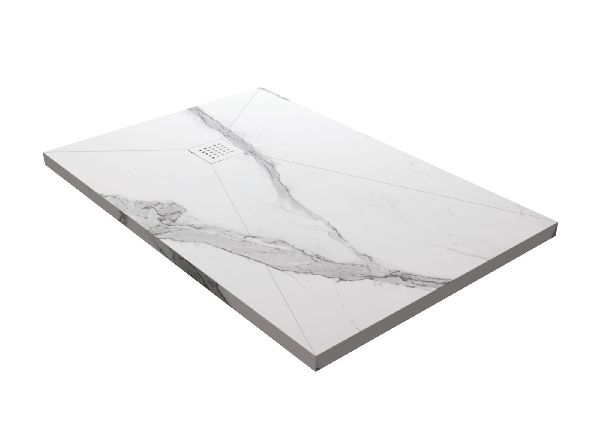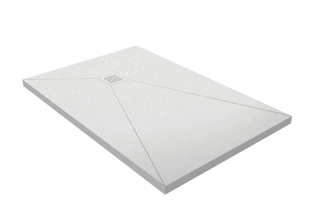 El plato de ducha Blade tiene un desagüe descentrado en el acabado.