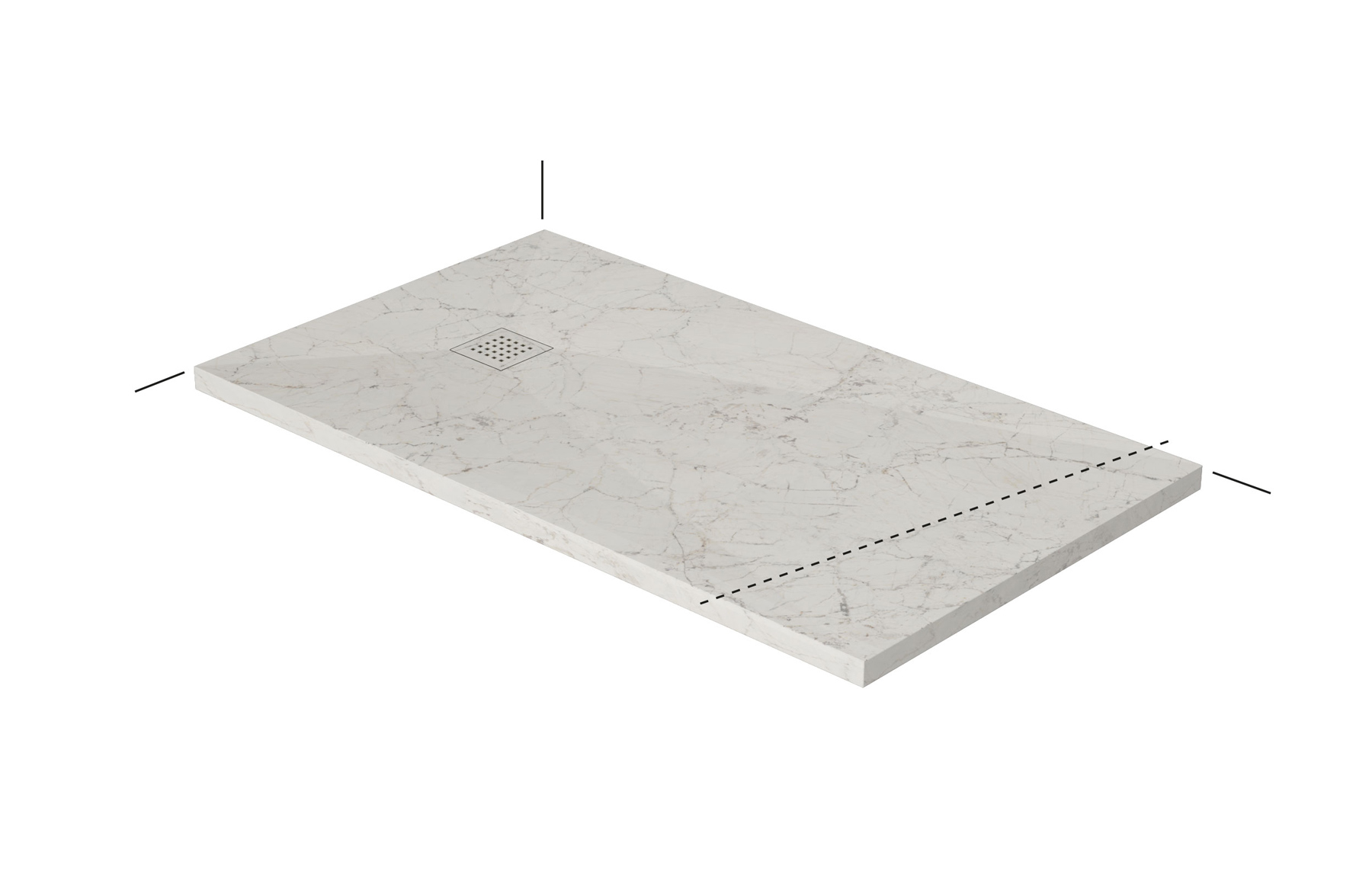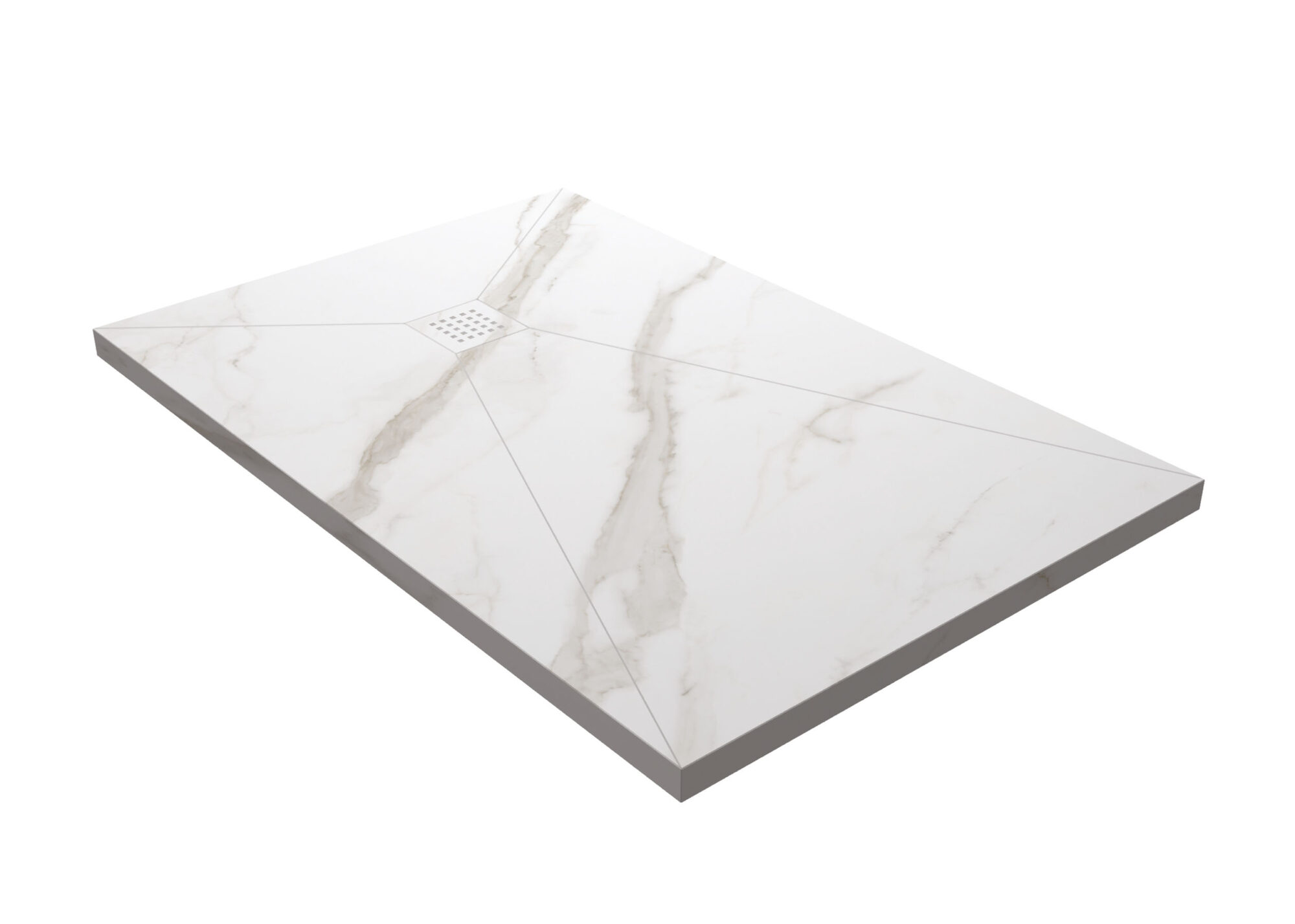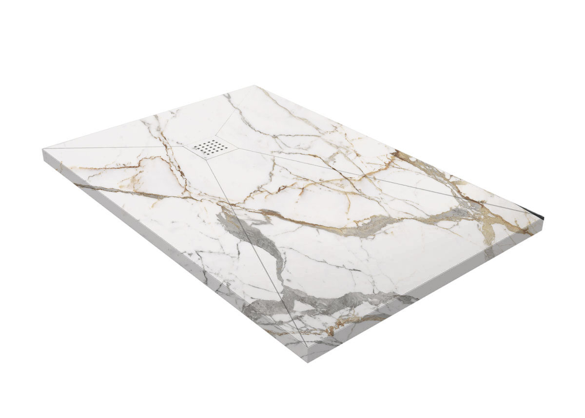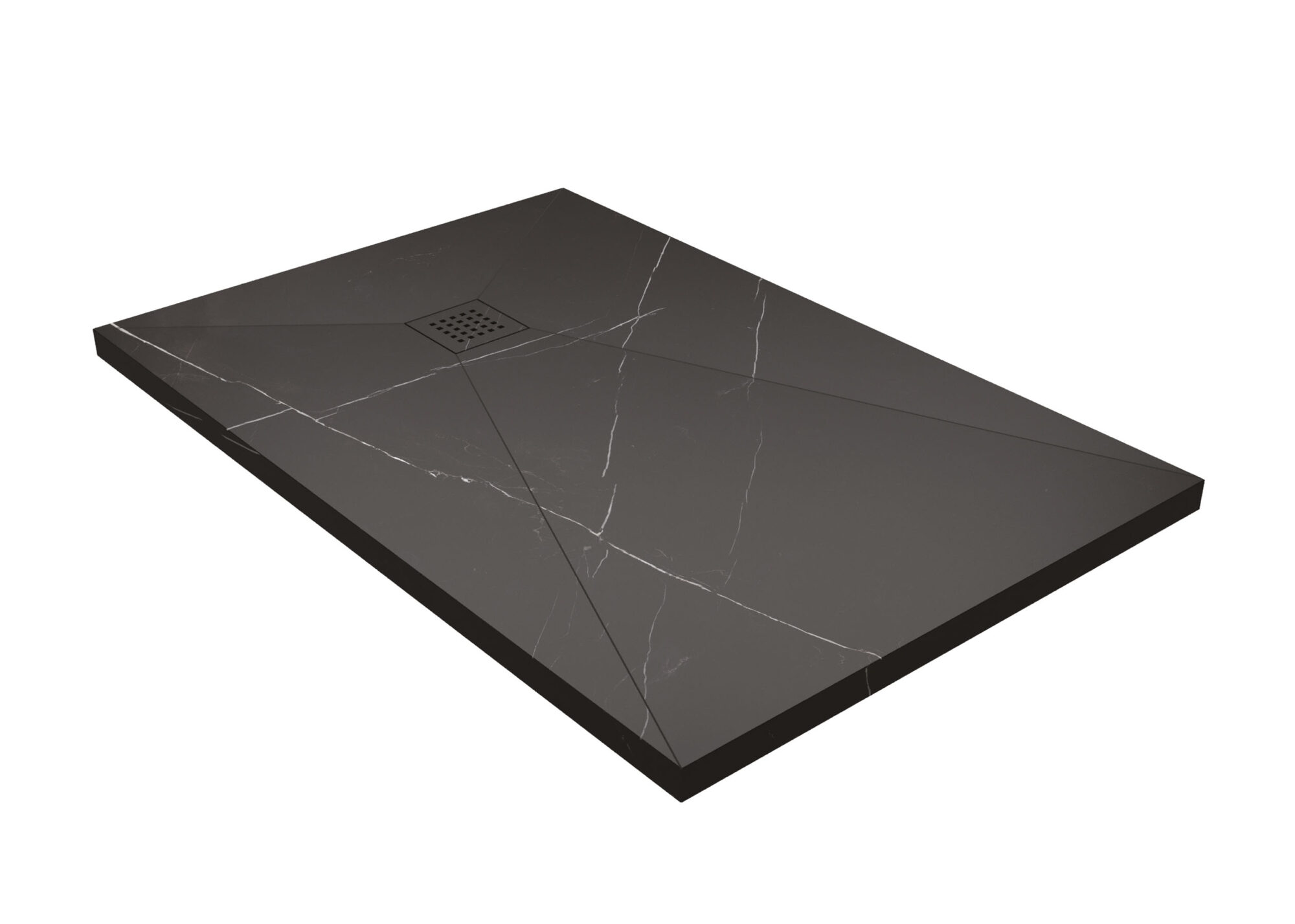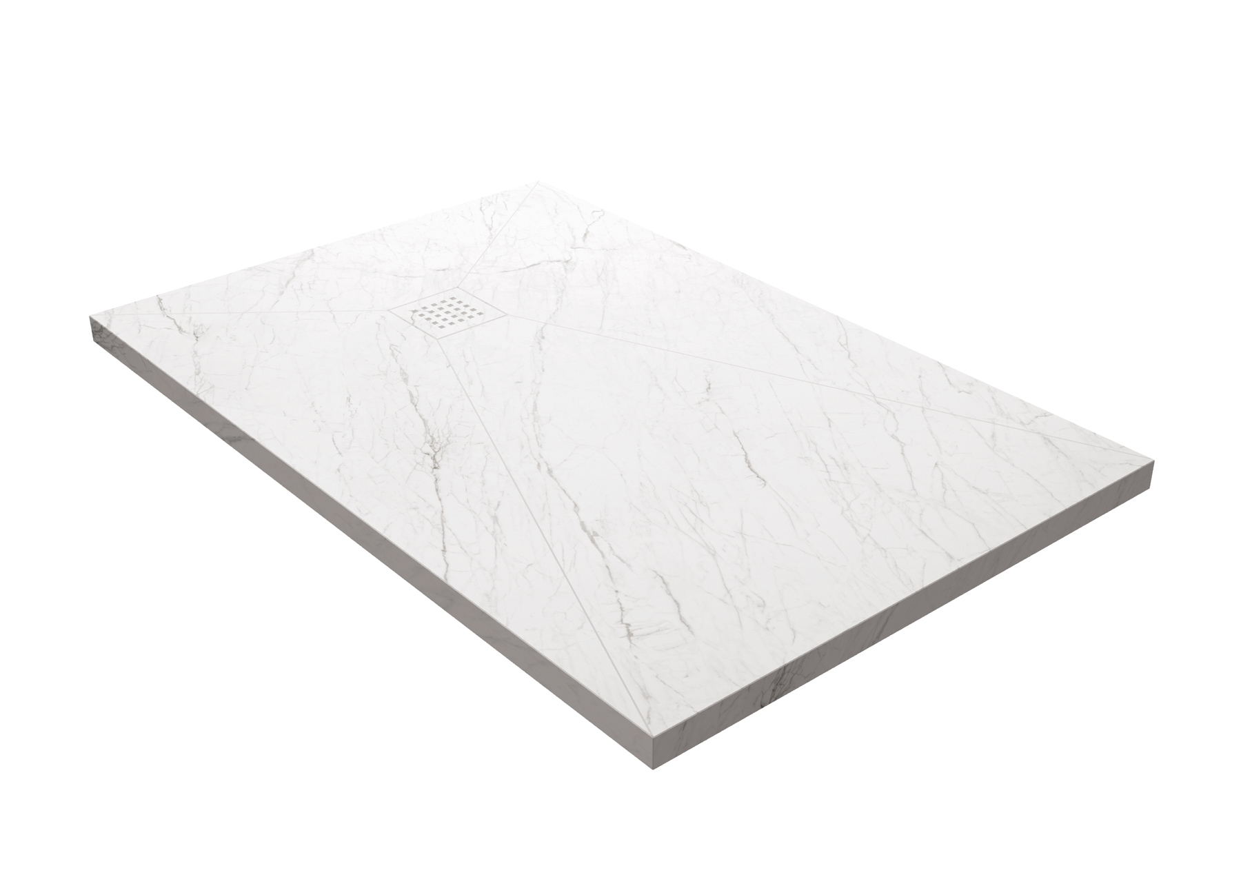 El plato de ducha Blade tiene un desagüe descentrado en el acabado.