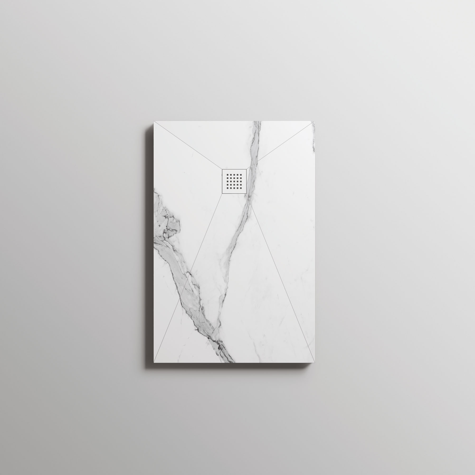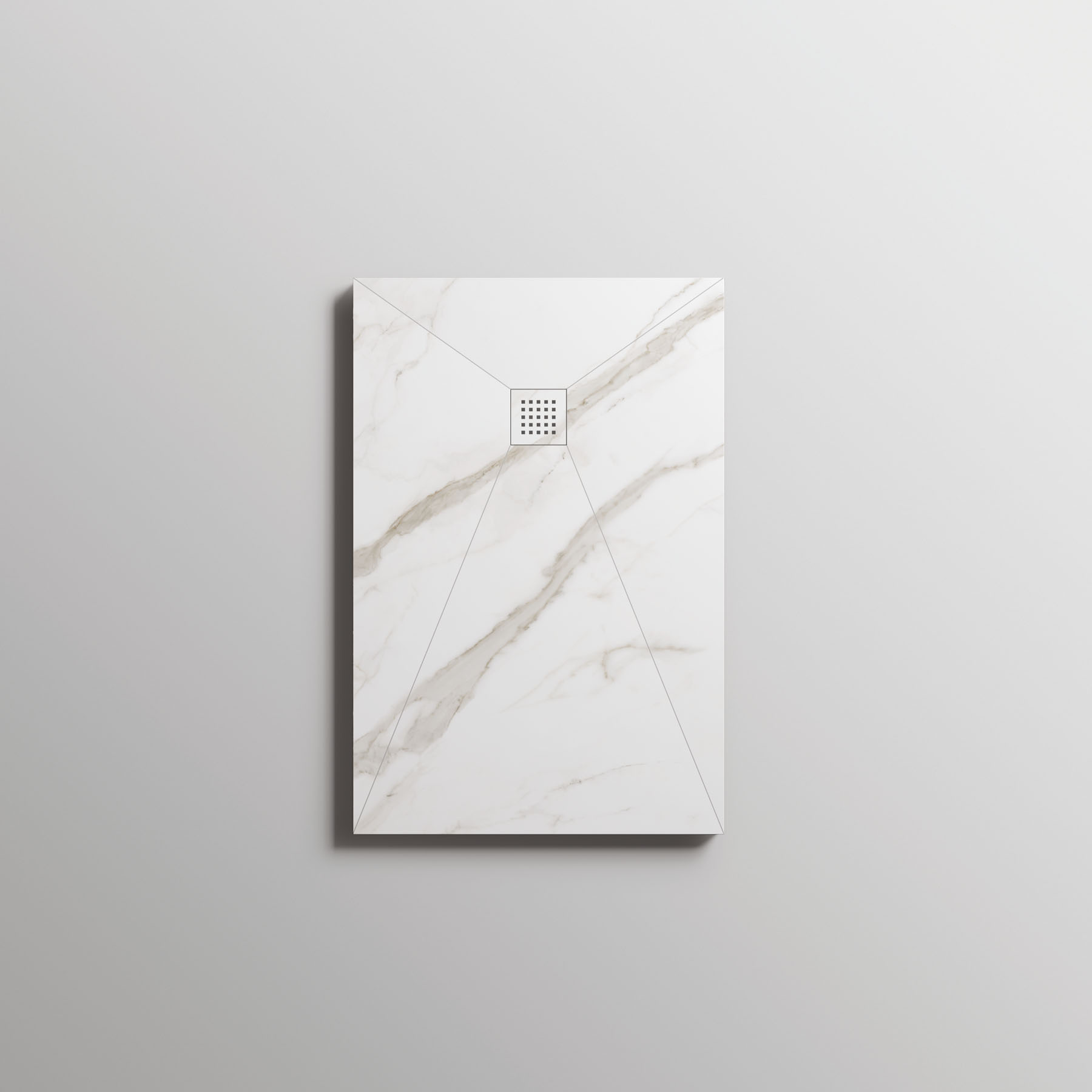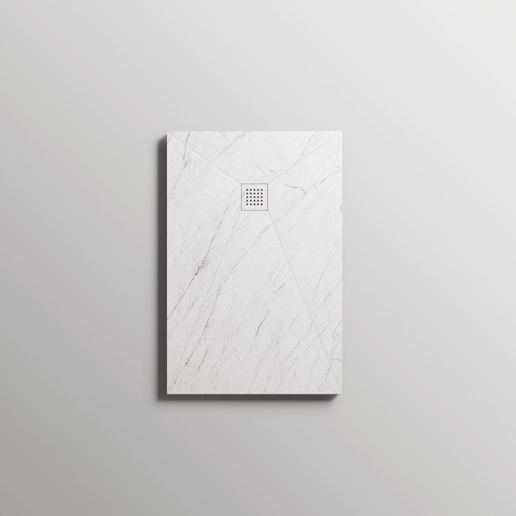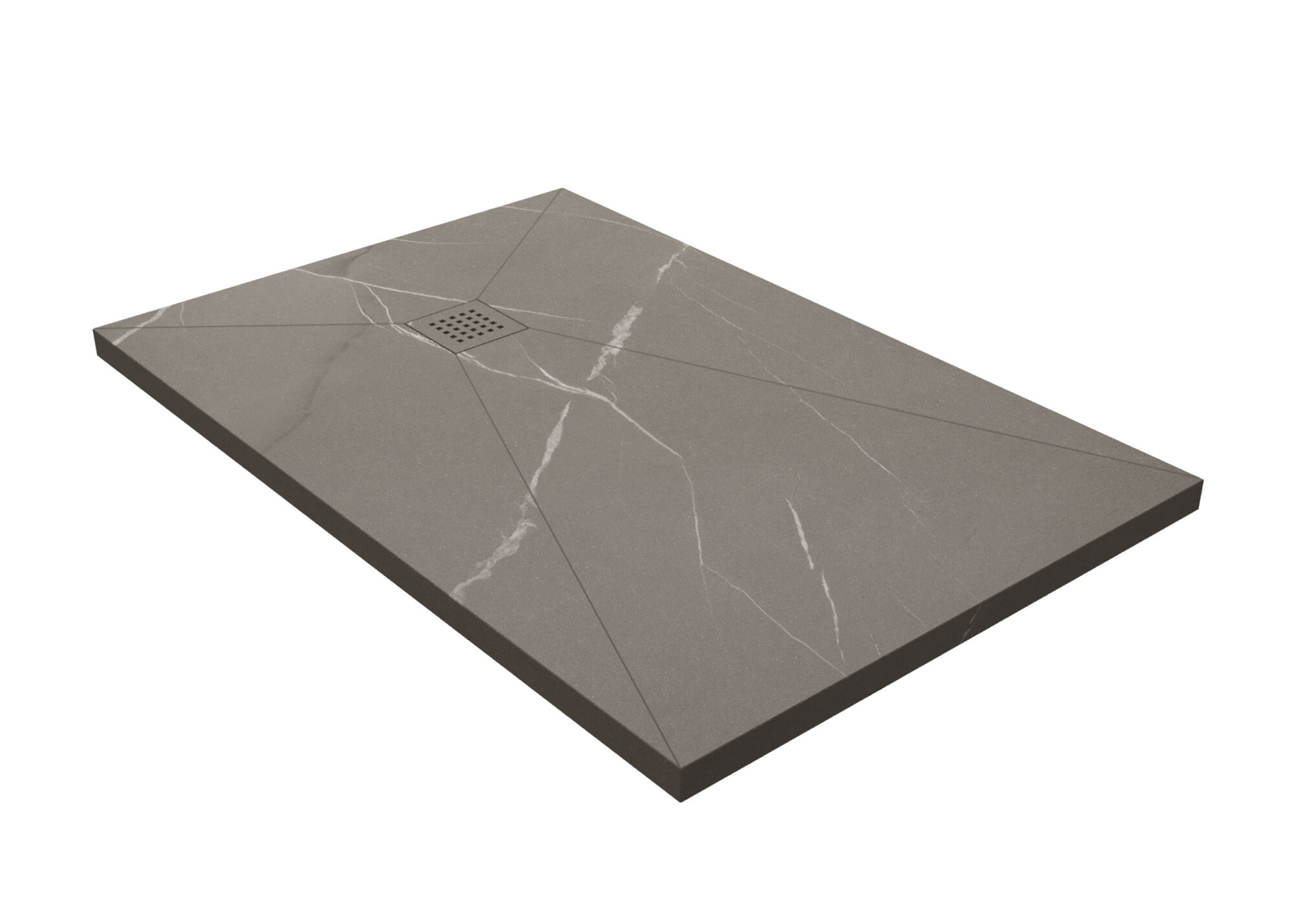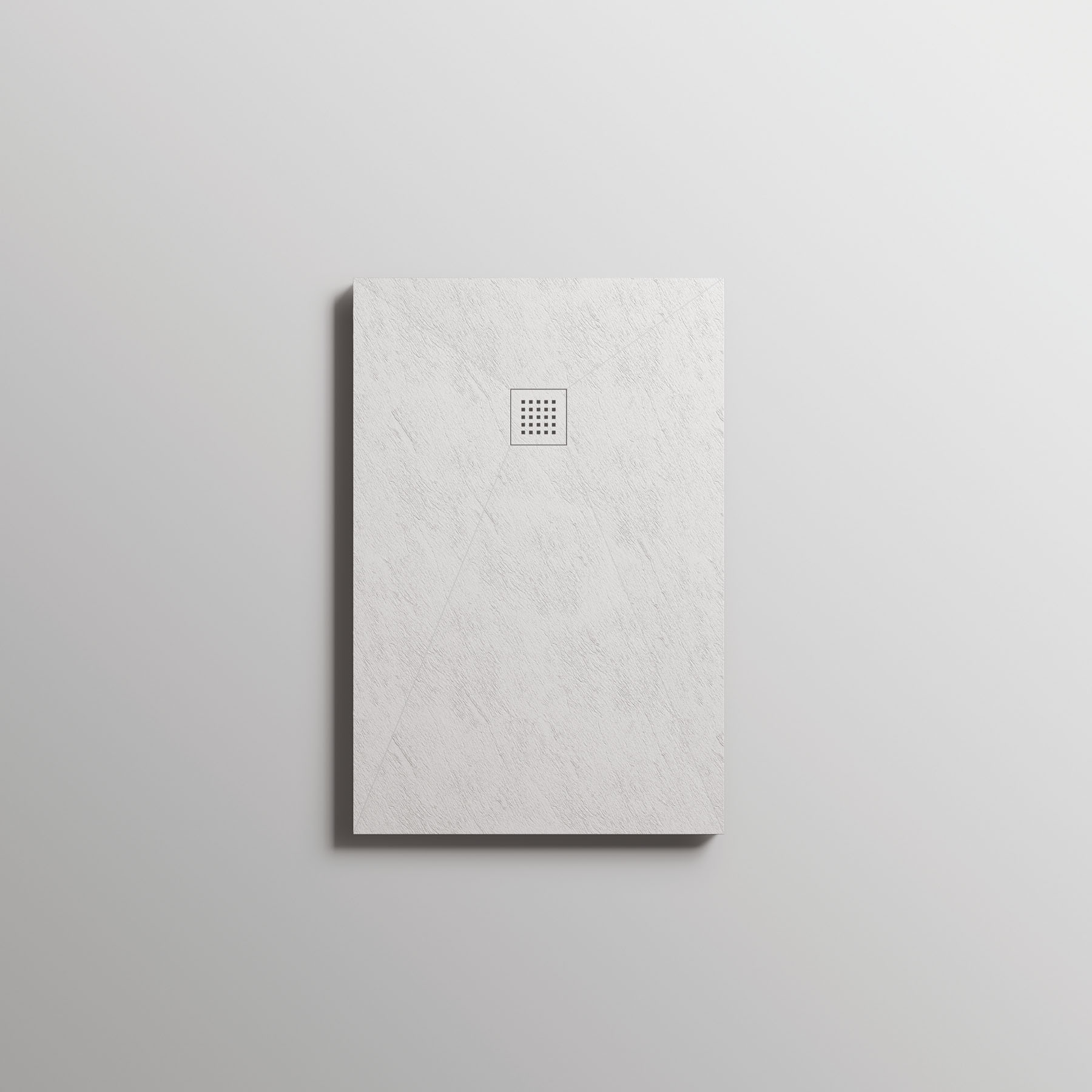 El plato de ducha Blade tiene un desagüe descentrado en el acabado.