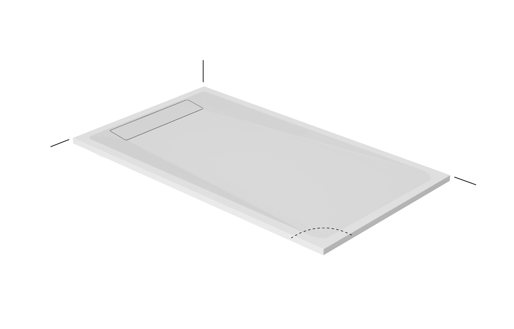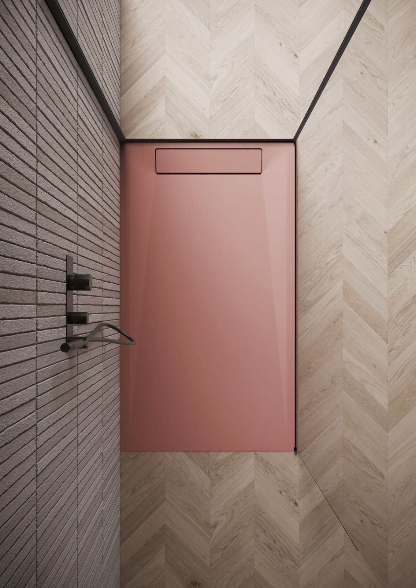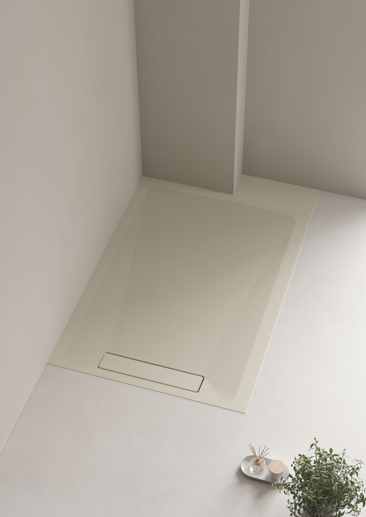 Un plato de ducha elegante con desagüe rectangular colocado en el lado corto, disponible a juego, con una textura peculiar agradable al tacto. Este modelo permite una producción a medida.