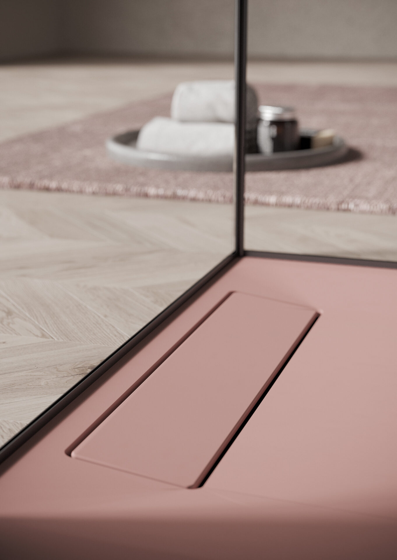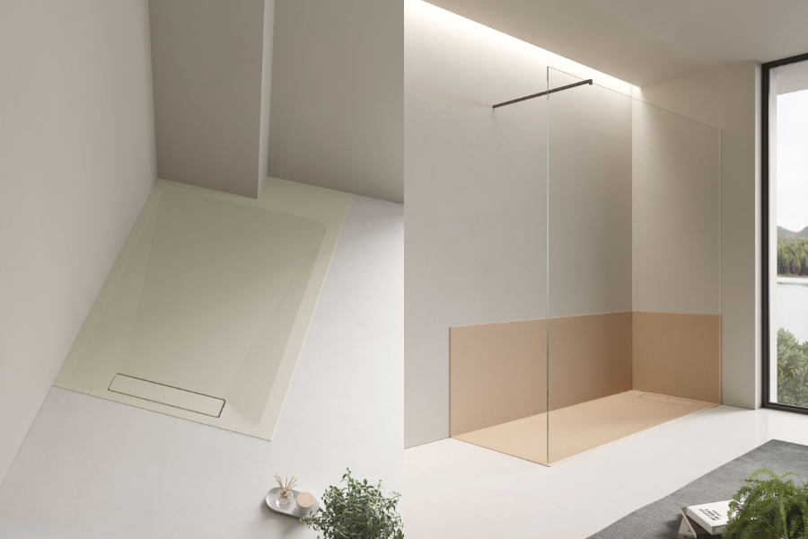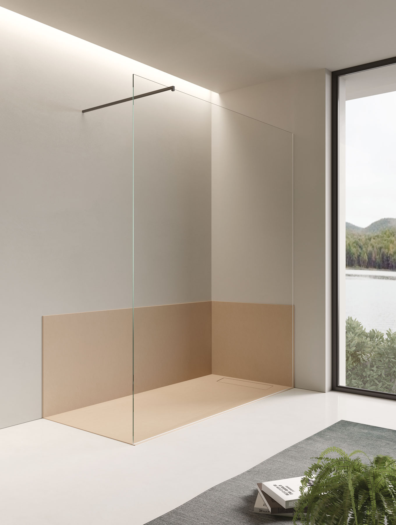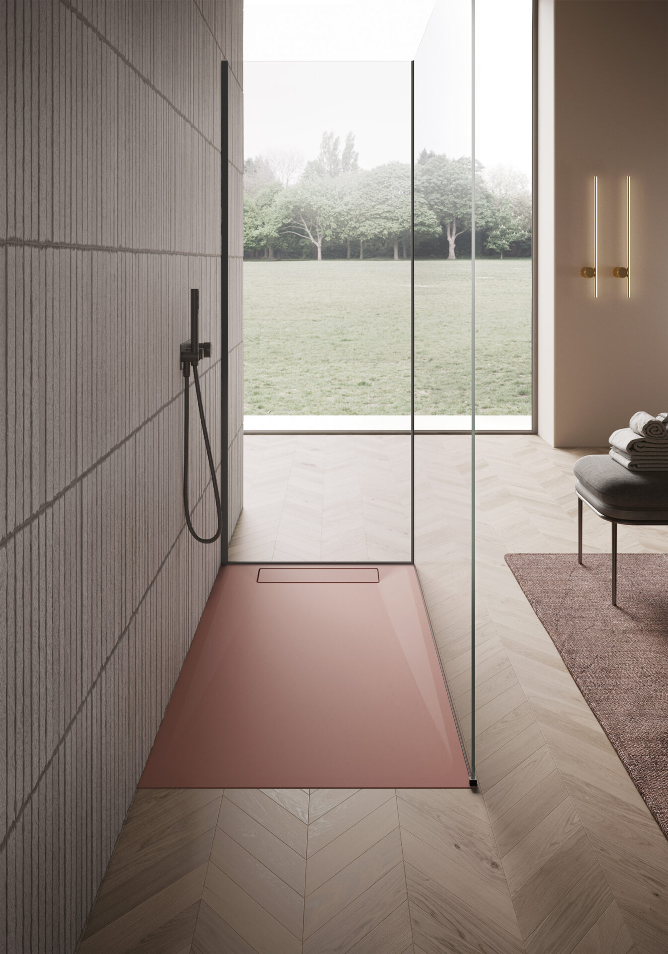 El plato de ducha Línea se puede personalizar y combinar con el revestimiento de pared en el mismo acabado.