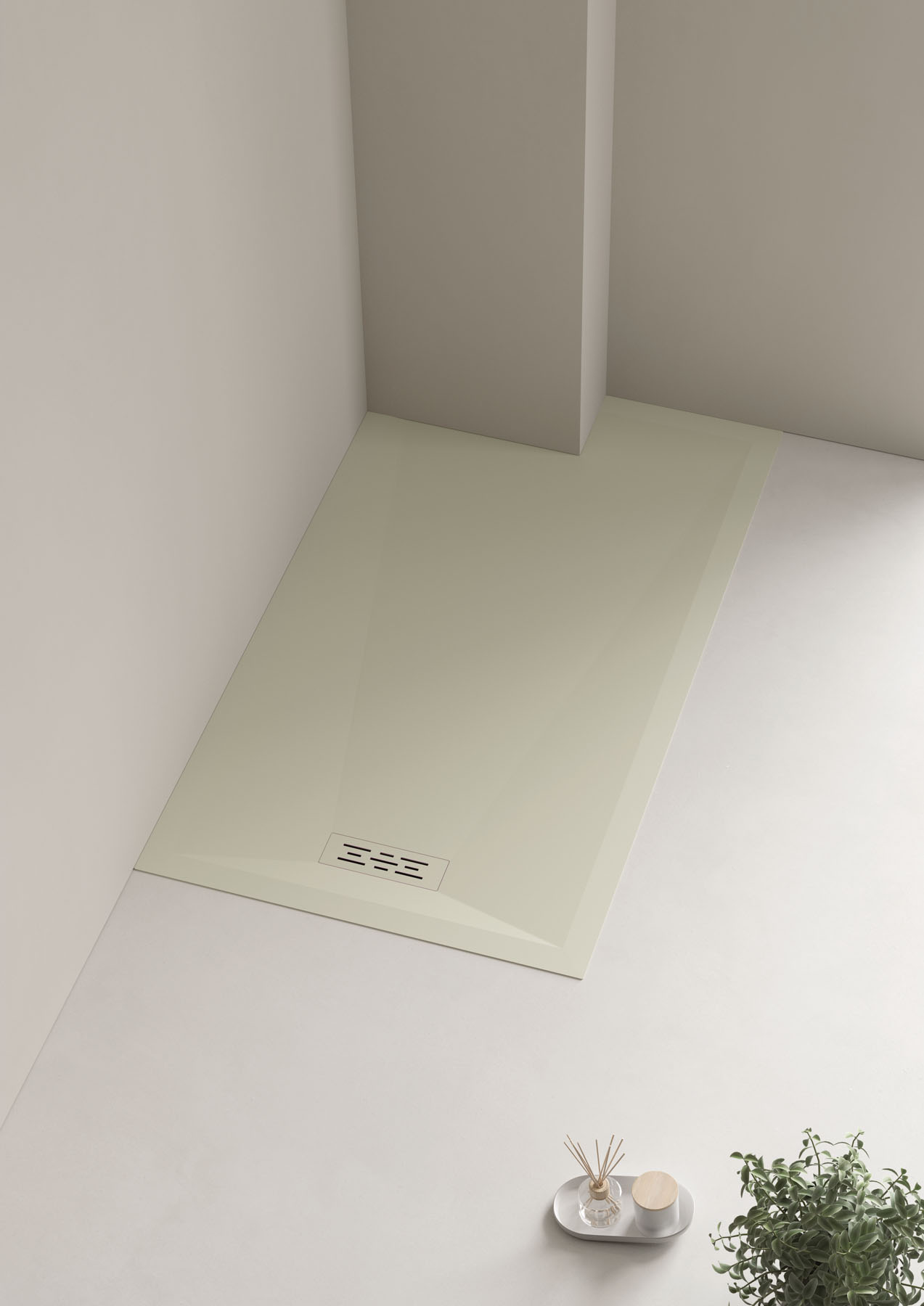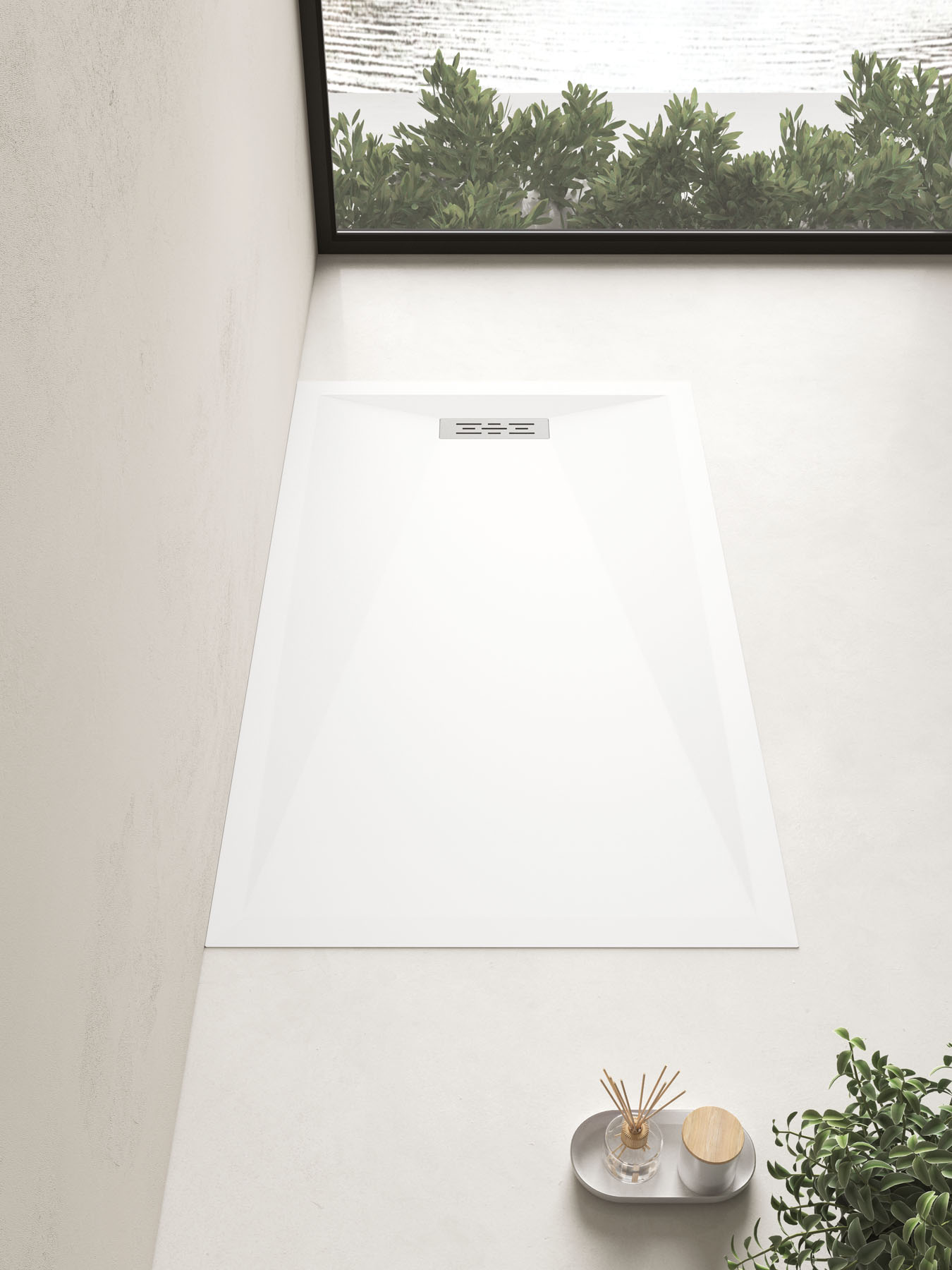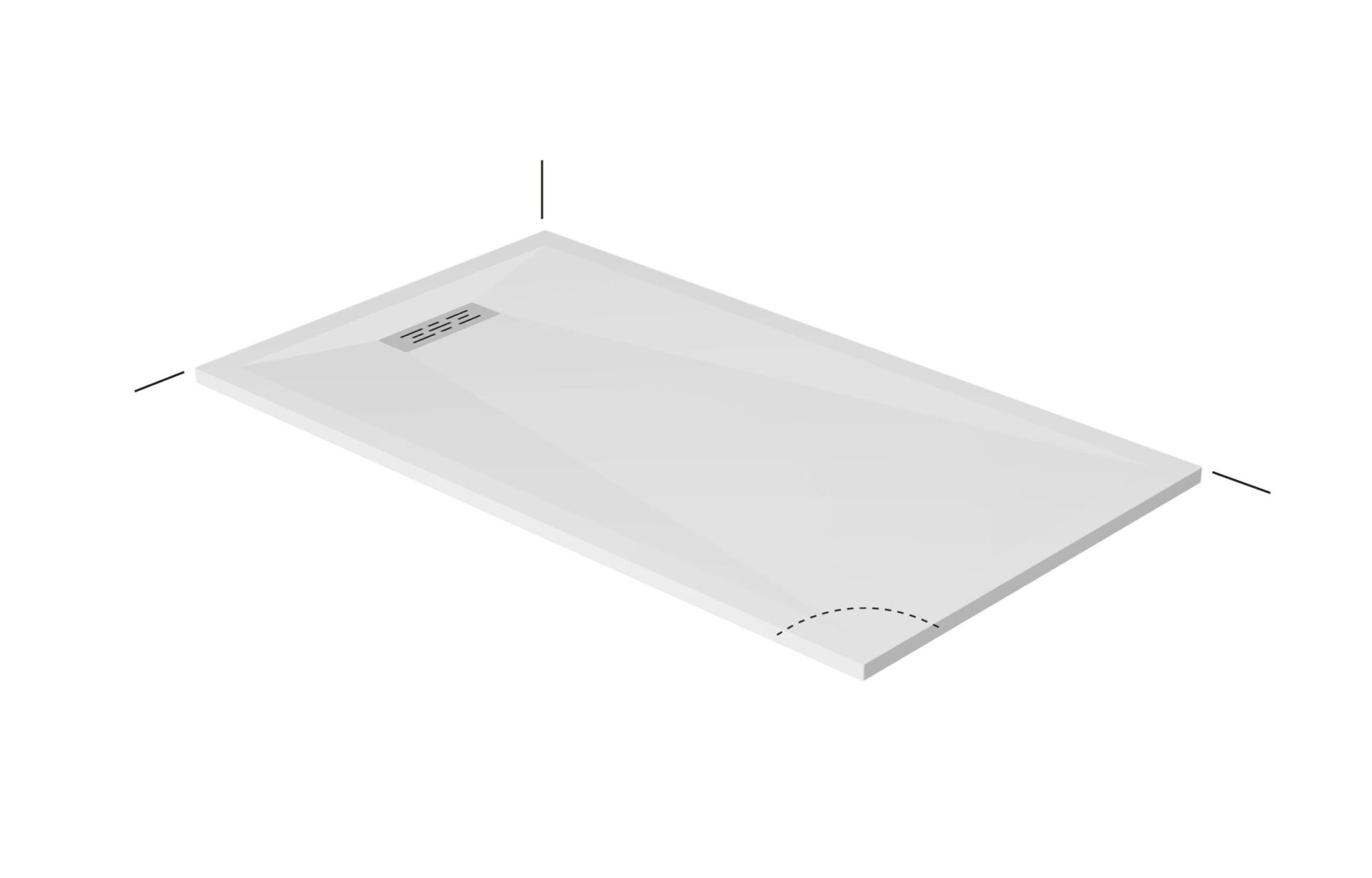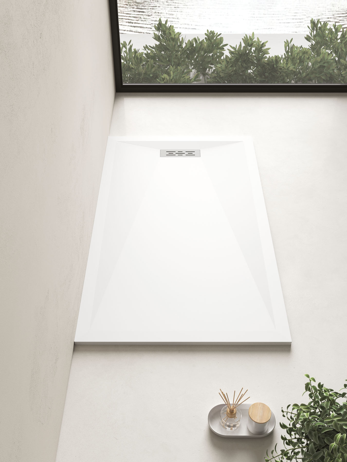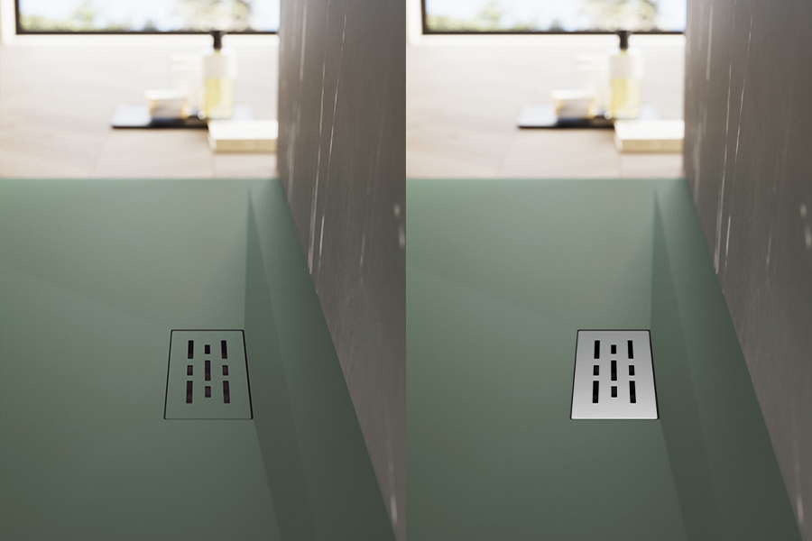 Líneas y geometrías definen una pureza de diseño en el plato de ducha de Tecnogel Twenty con desagüe rectangular descentrado, que puede colocarse también en el lado largo.