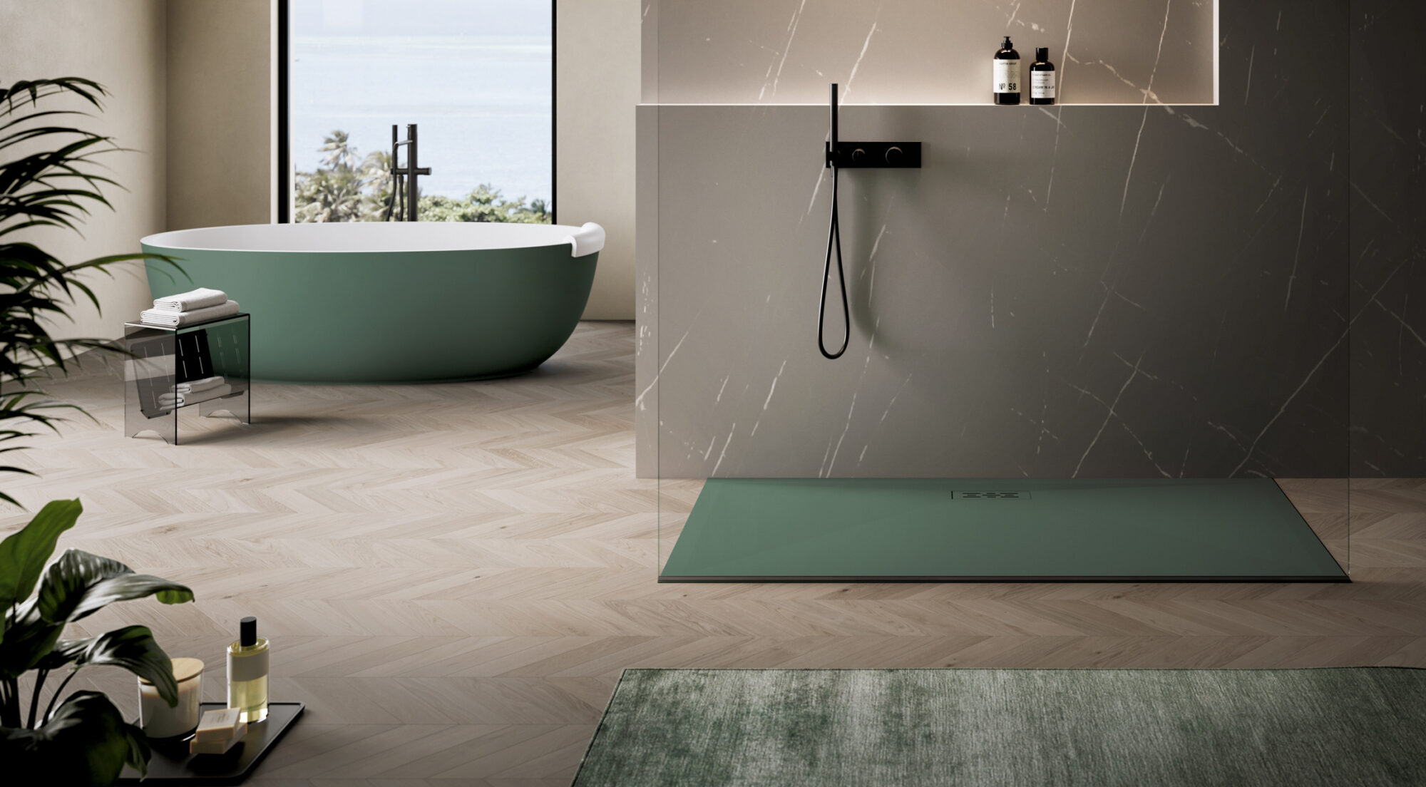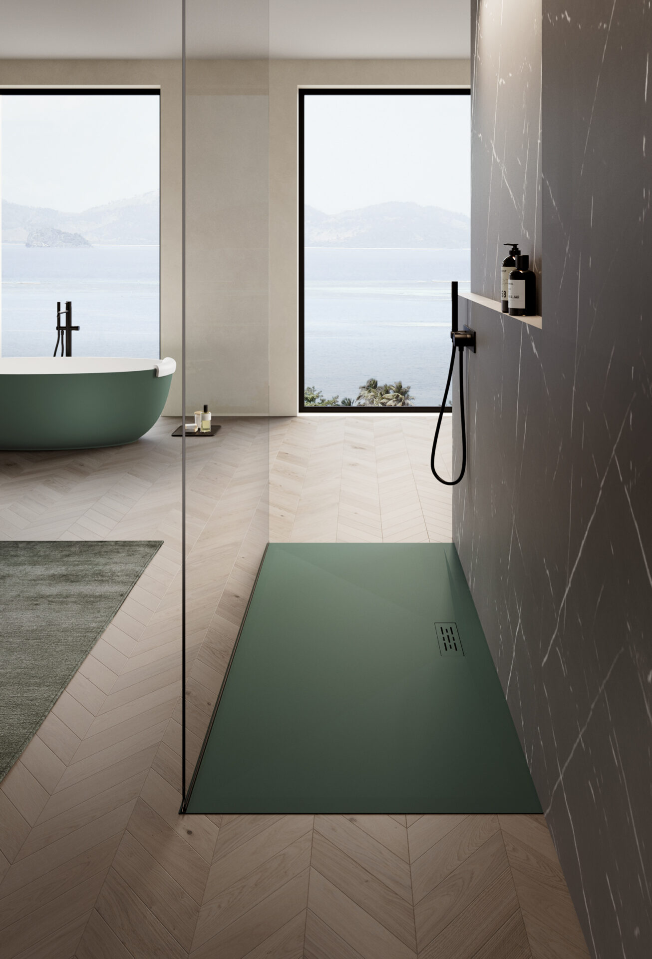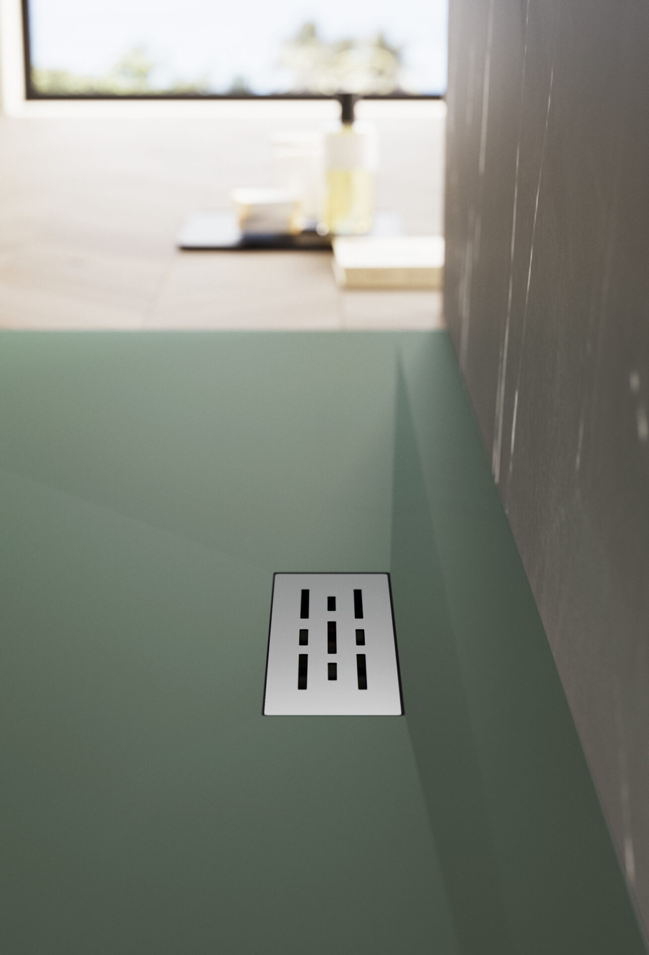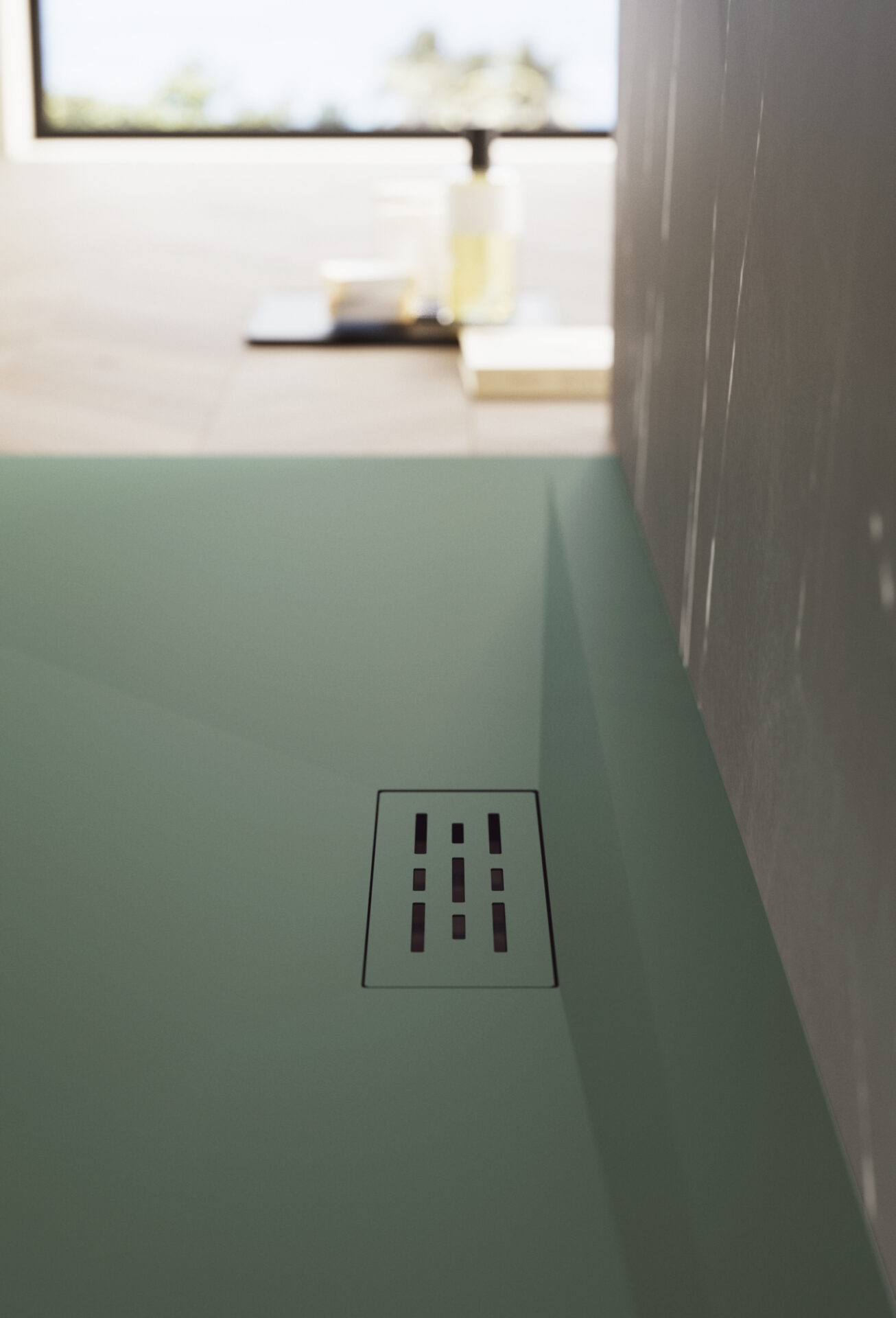 Líneas y geometrías definen una pureza de diseño en el plato de ducha de Tecnogel Twenty con desagüe rectangular descentrado, que puede colocarse también en el lado largo.