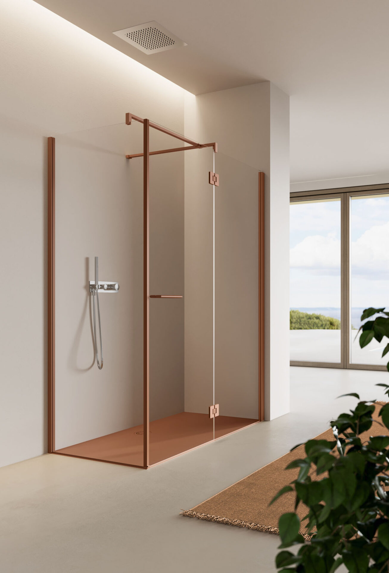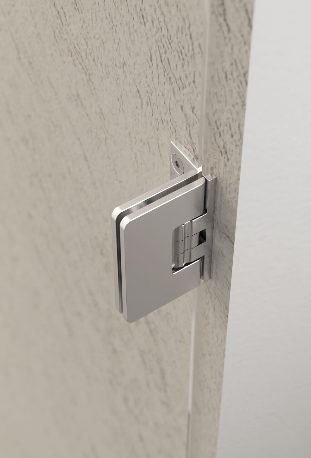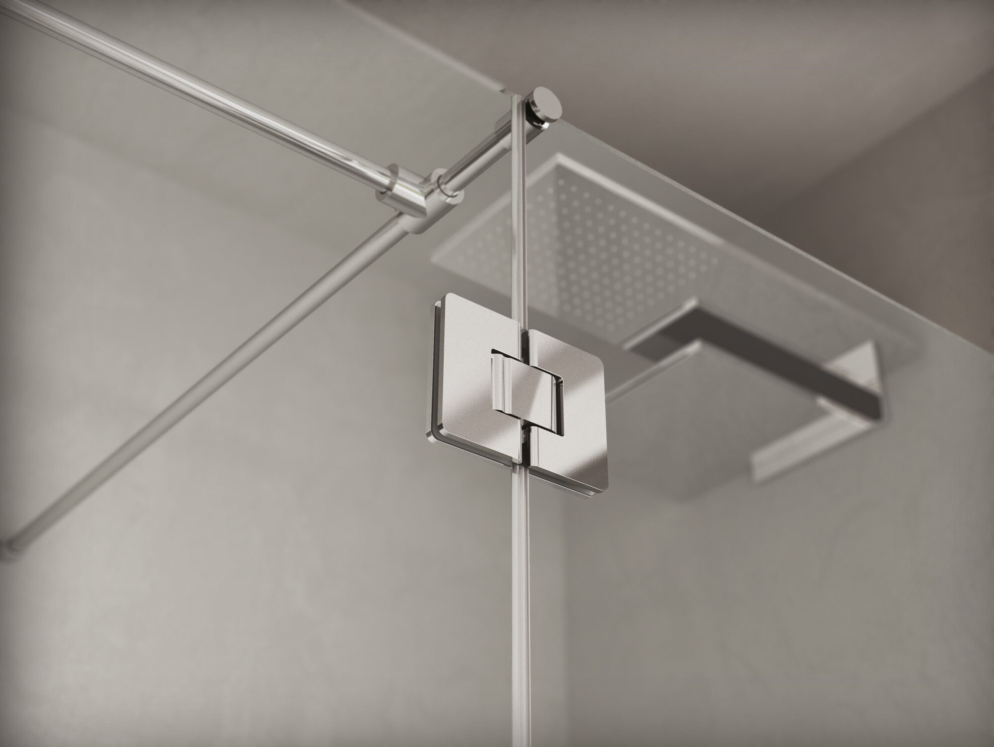 Diseño de la cabina con precisión milimétrica. Bisagra minimalista con apertura a presión de vidrio a pared.