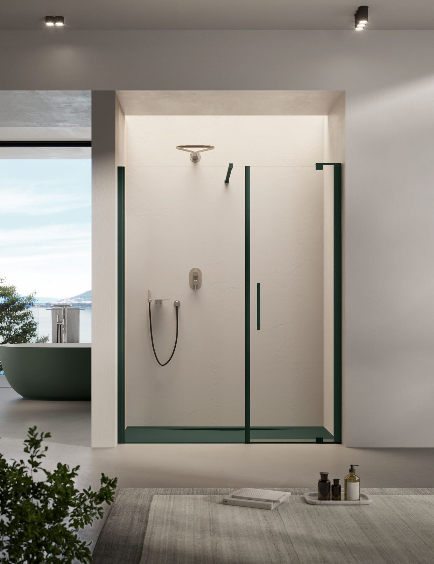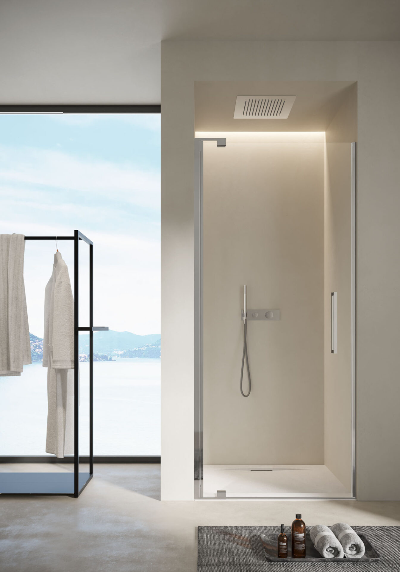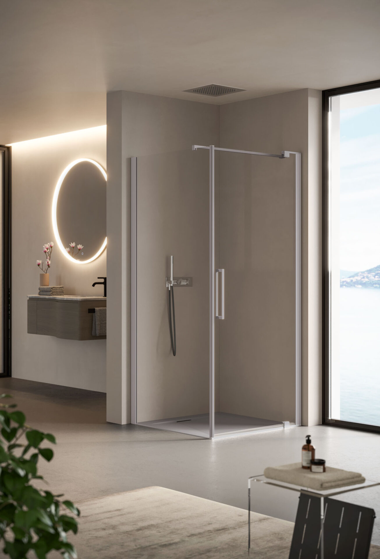 Slim: la cabina de ducha sin bastidor de formas esenciales, con puerta batiente y de doble batiente, disponible en la versión con mampara frontal, angular y sobre un muro bajo. El tirador es de doble cara. La bisagra pivotante contribuye a comunicar una sensación de ligereza facilitando la regulación.