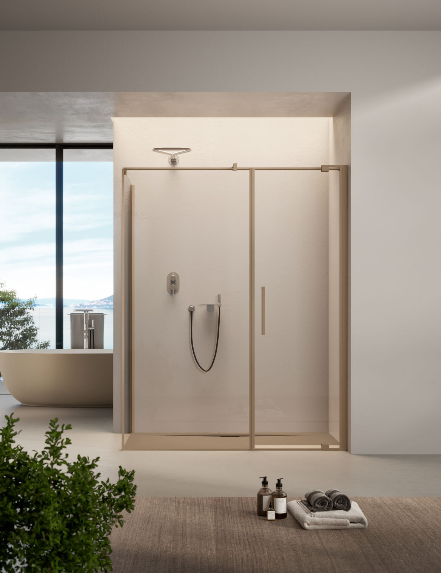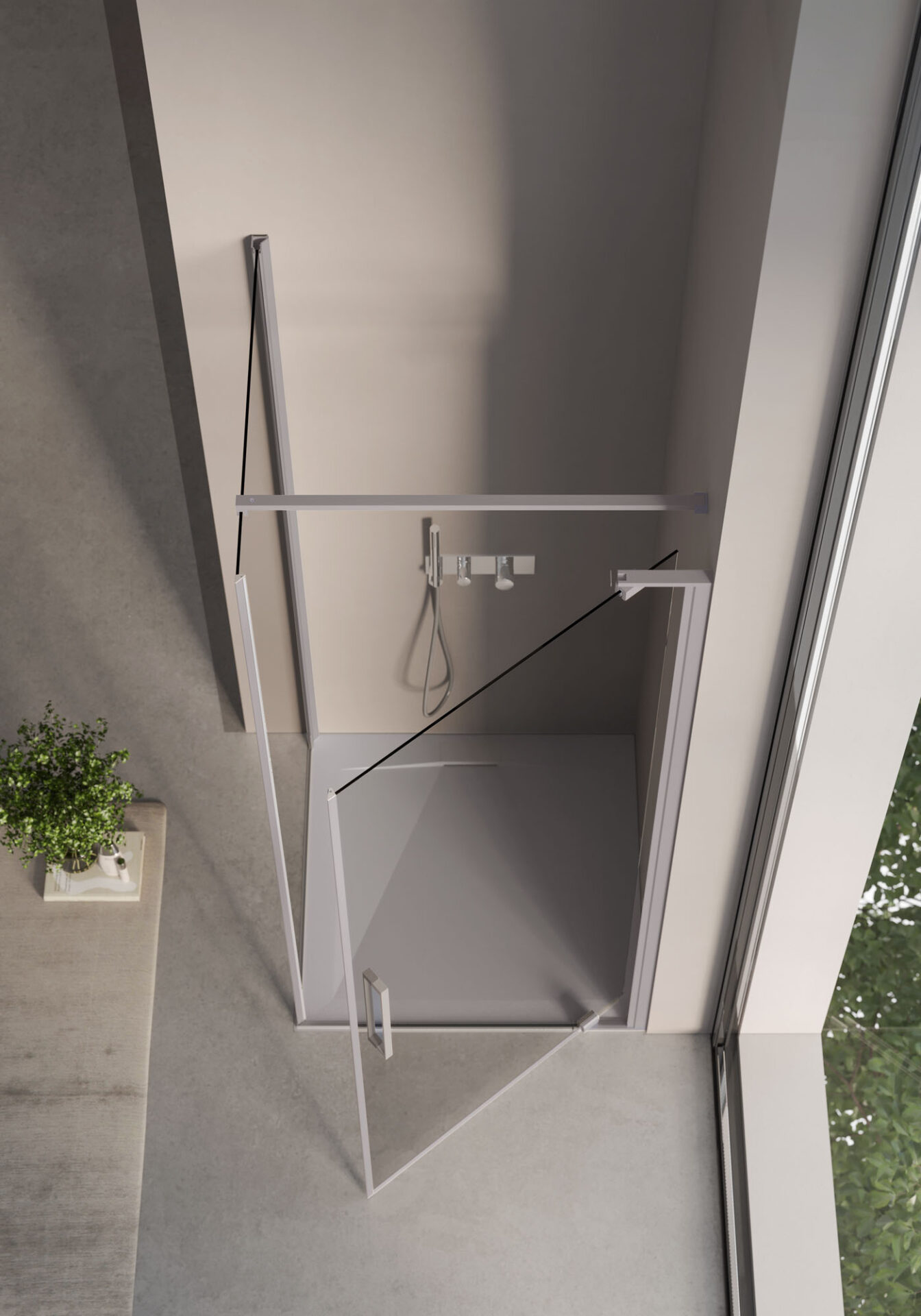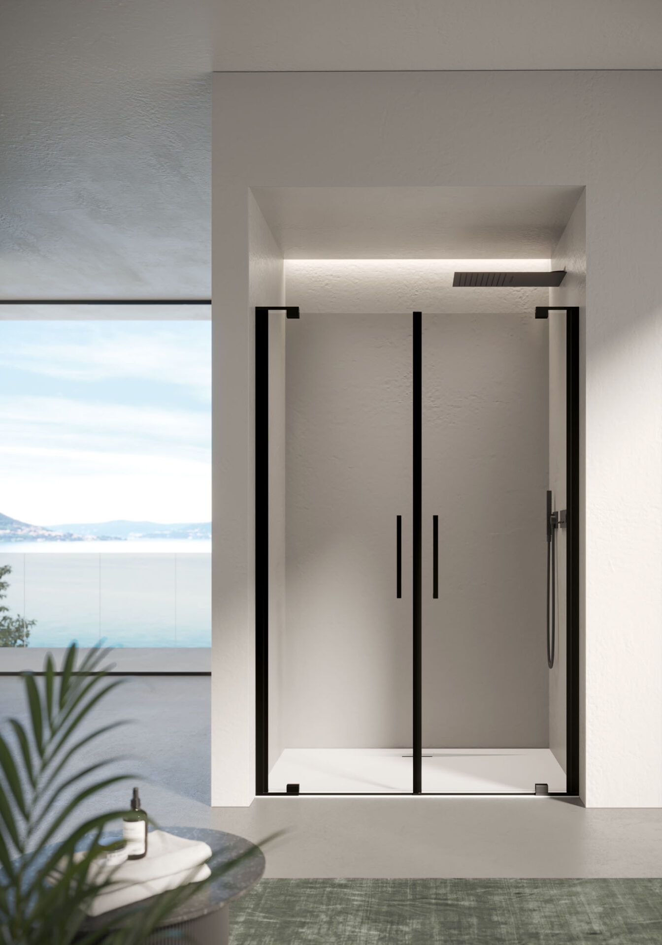 Slim: la cabina de ducha sin bastidor de formas esenciales, con puerta batiente y de doble batiente, disponible en la versión con mampara frontal, angular y sobre un muro bajo. El tirador es de doble cara. La bisagra pivotante contribuye a comunicar una sensación de ligereza facilitando la regulación.