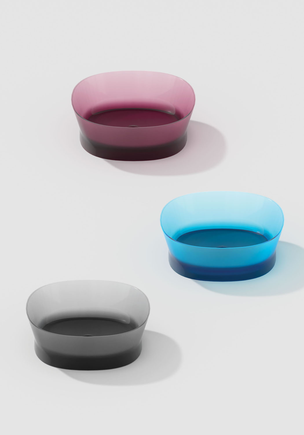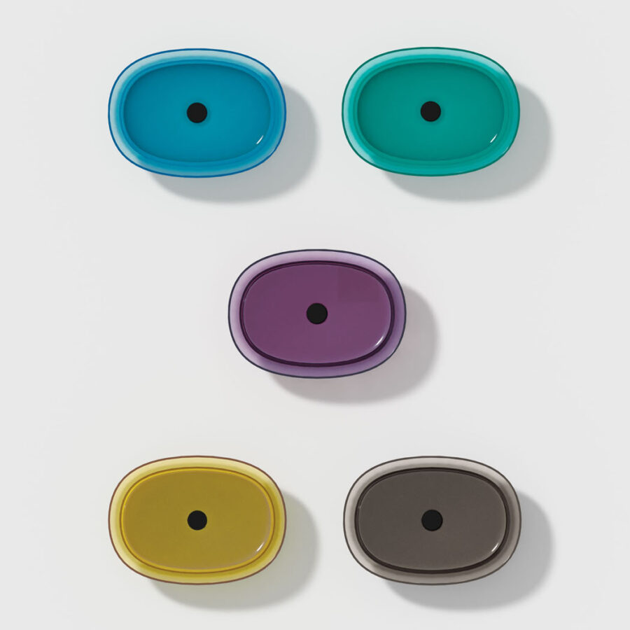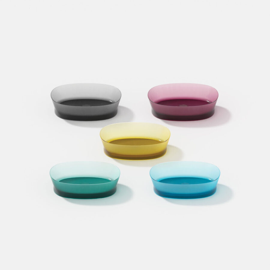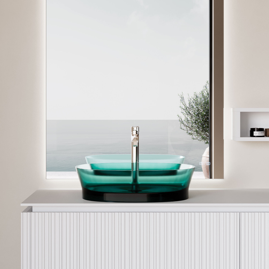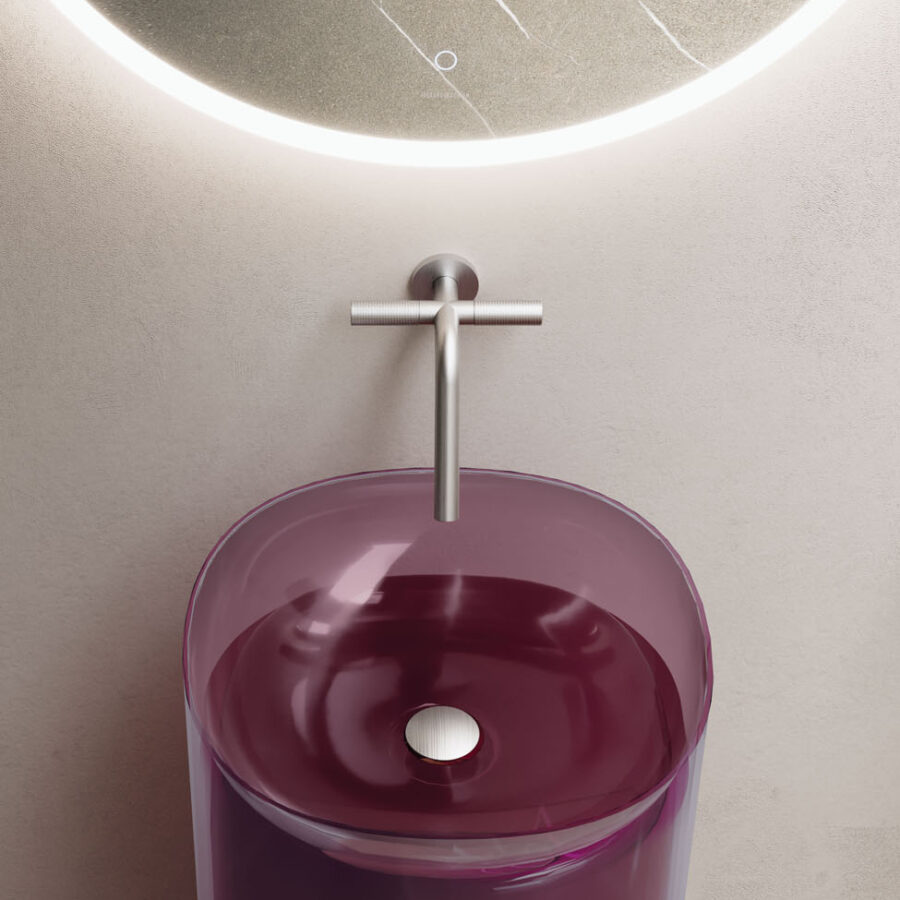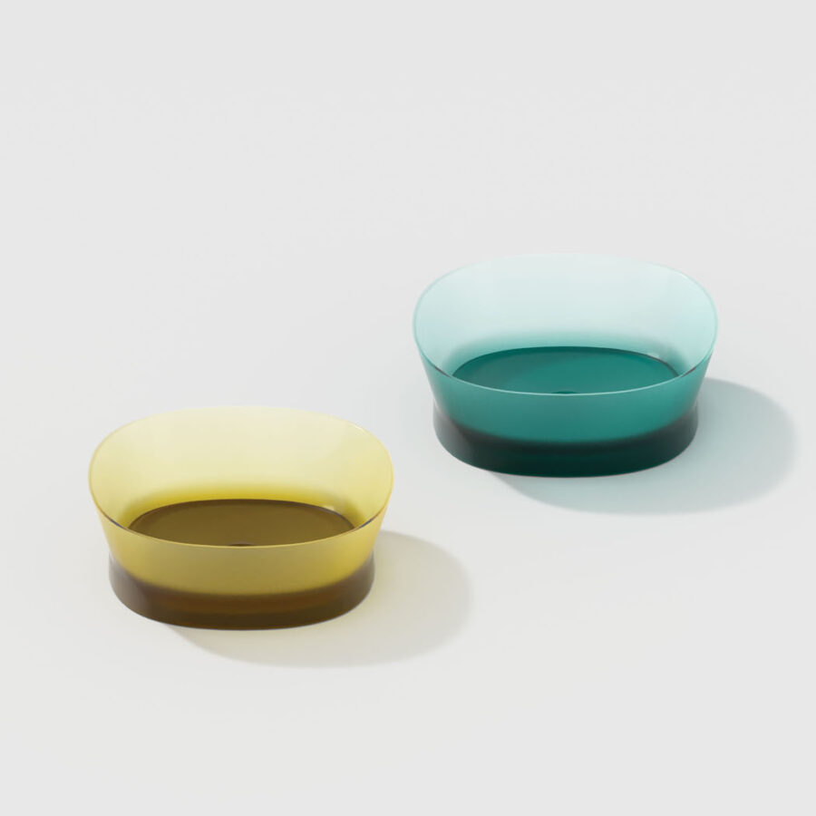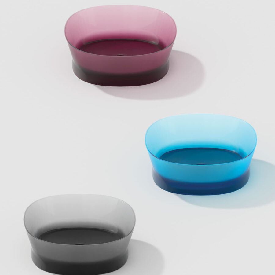 Una nueva colección de baño realizada en Khromalite, un material innovador especialmente apreciado por sus superficies transparentes y coloreadas de brillo extraordinario, que incluye: una bañera disponible en dos tamaños (L 158 x P 77 x H 59 cm y L 173 x P 84,5 x H 59,5 cm), un lavabo cuadrado, un lavabo rectangular y un lavabo independiente. Esta resina de nueva generación, coloreable, duradera y versátil, es especialmente agradable por su transparencia y brillantez, está compuesta por resina de poliéster de alta calidad y pigmentos colorantes.