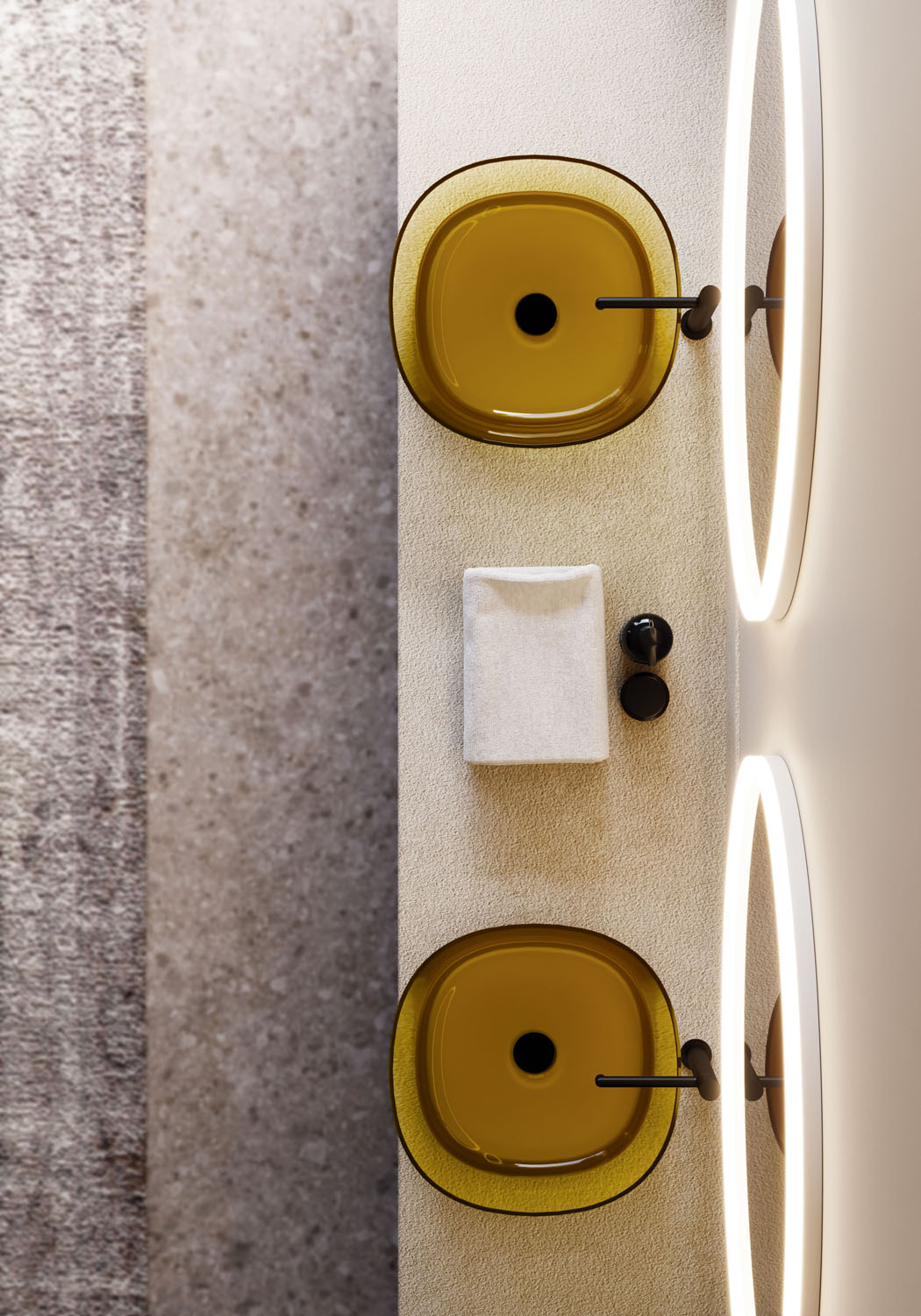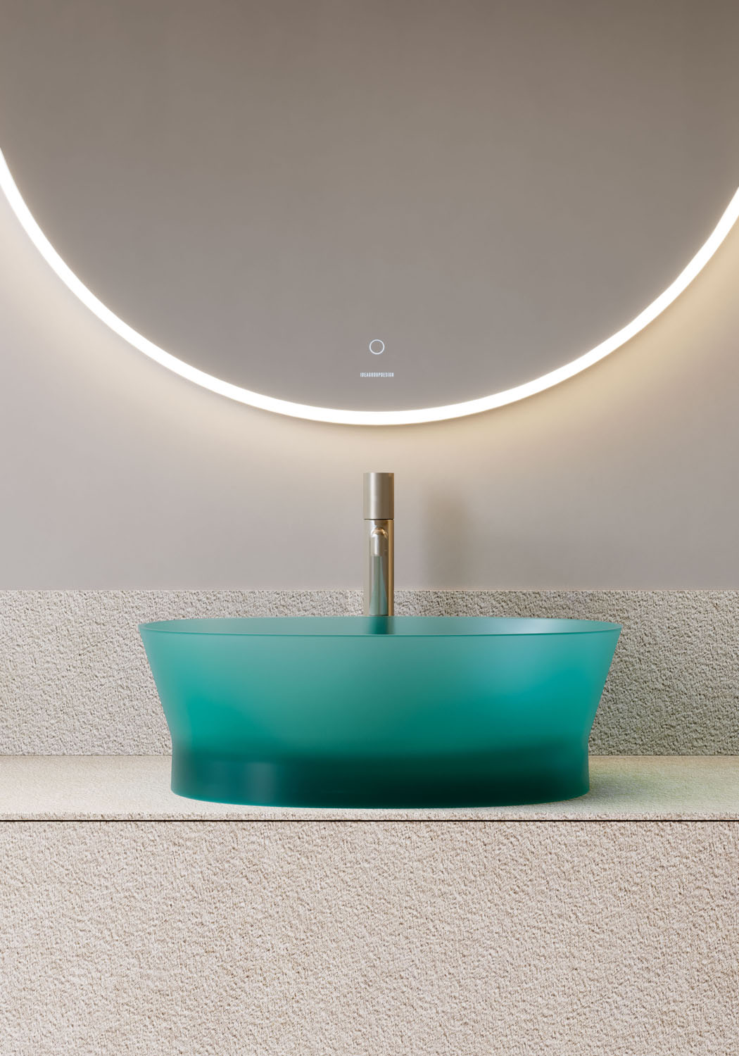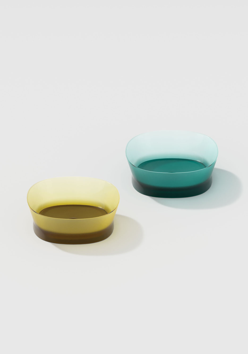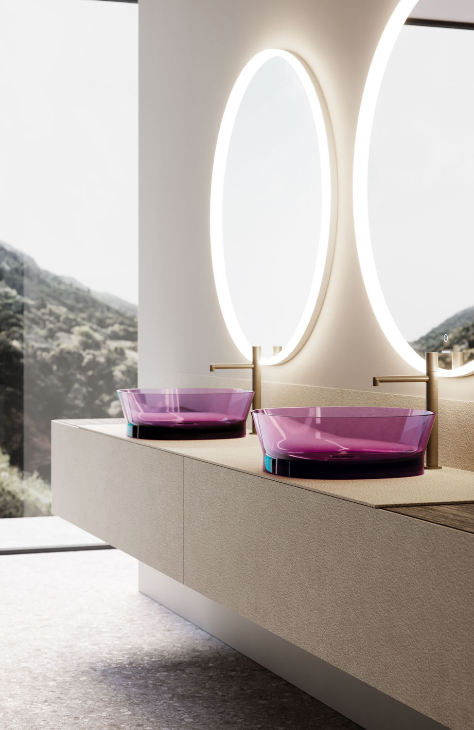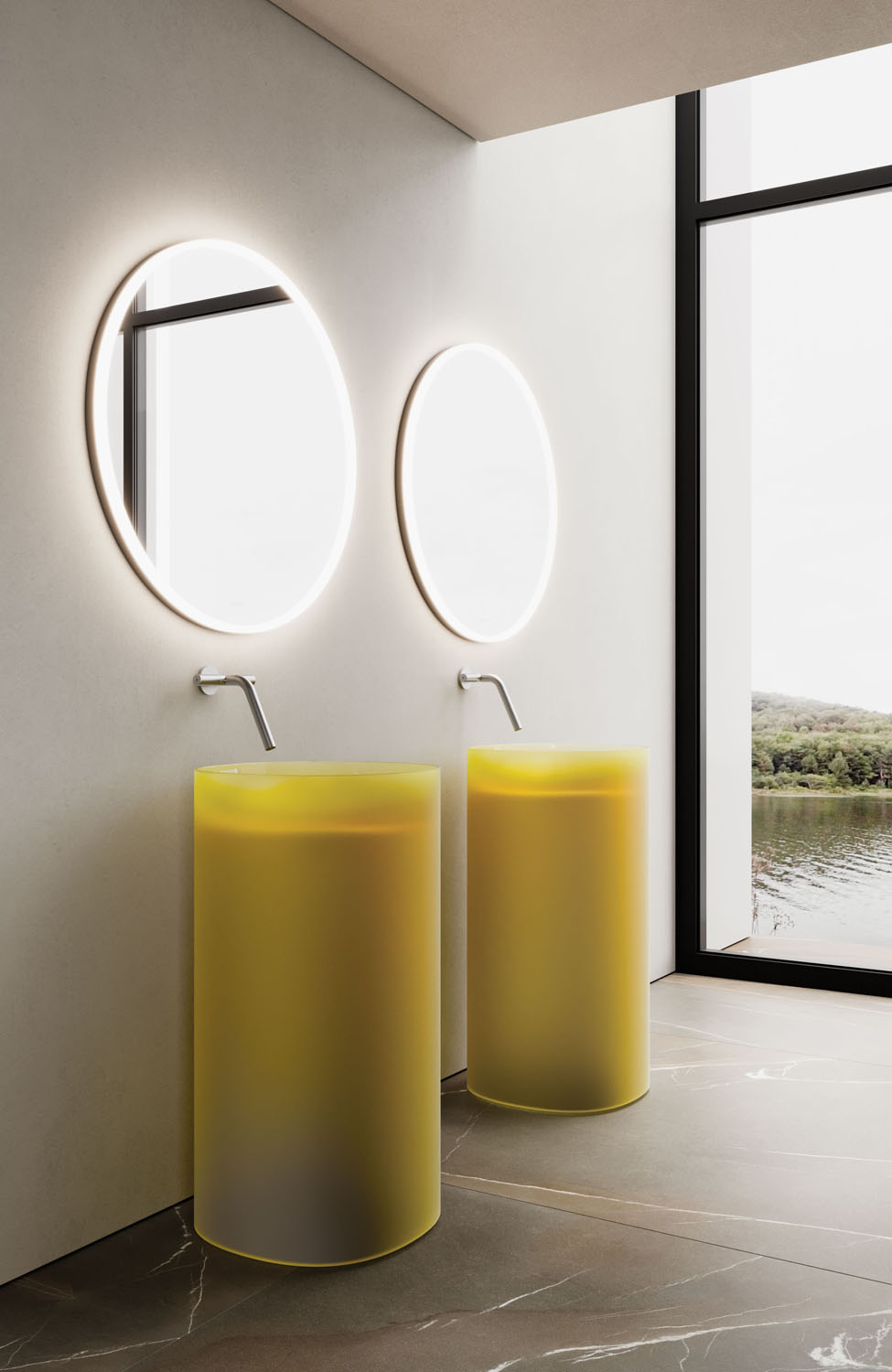 Una nueva colección de baño realizada en Khromalite, un material innovador especialmente apreciado por sus superficies transparentes y coloreadas de brillo extraordinario, que incluye: una bañera disponible en dos tamaños (L 158 x P 77 x H 59 cm y L 173 x P 84,5 x H 59,5 cm), un lavabo cuadrado, un lavabo rectangular y un lavabo independiente. Esta resina de nueva generación, coloreable, duradera y versátil, es especialmente agradable por su transparencia y brillantez, está compuesta por resina de poliéster de alta calidad y pigmentos colorantes.
